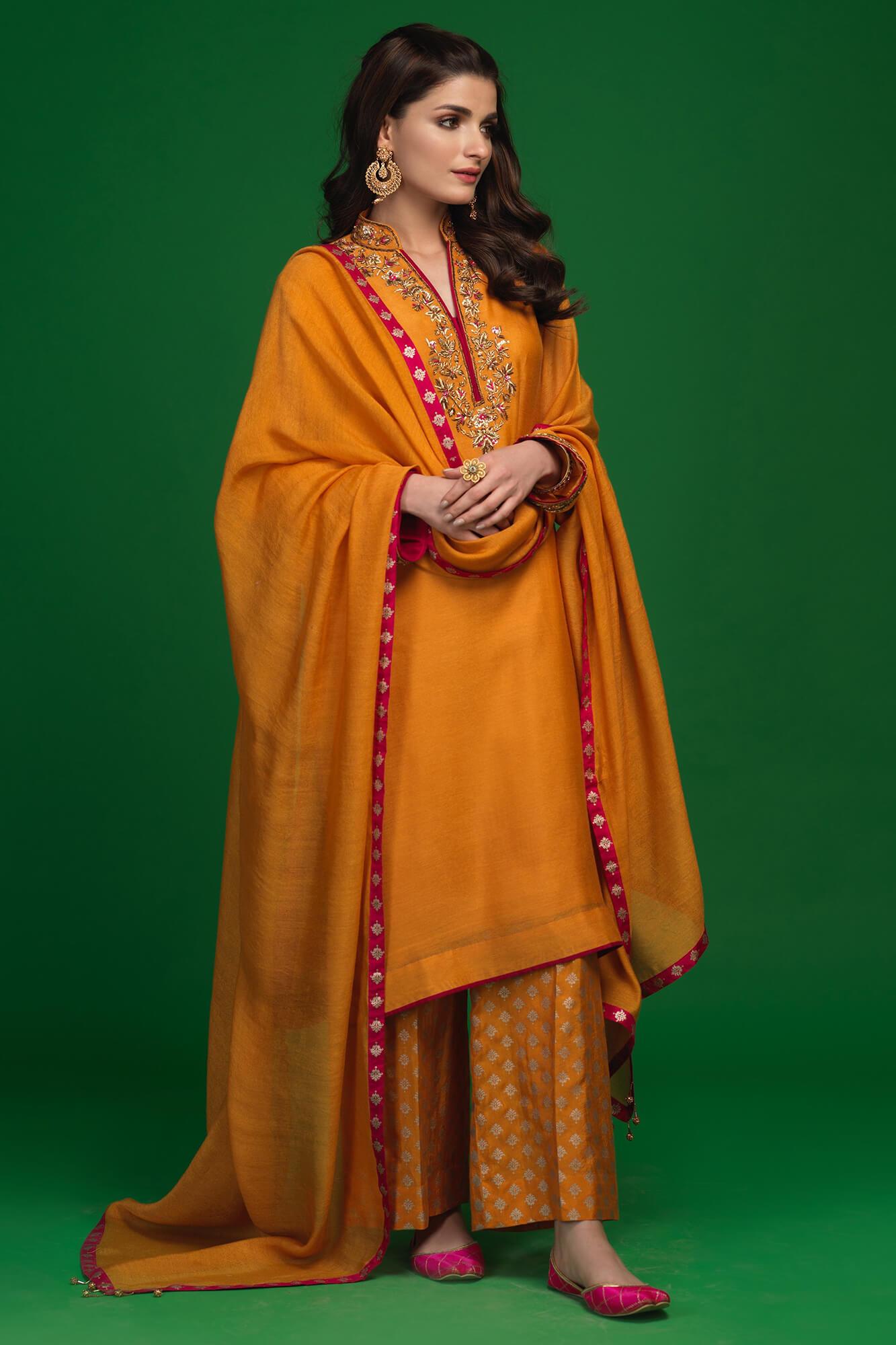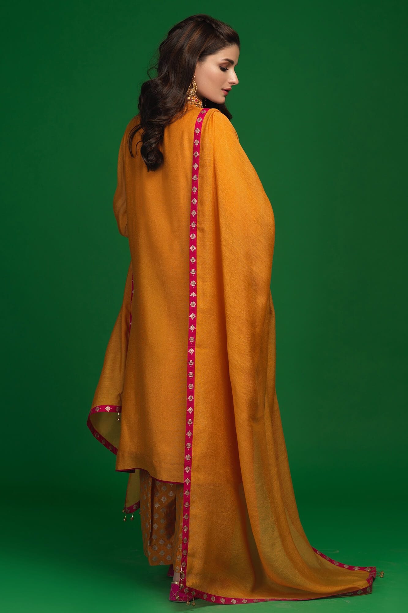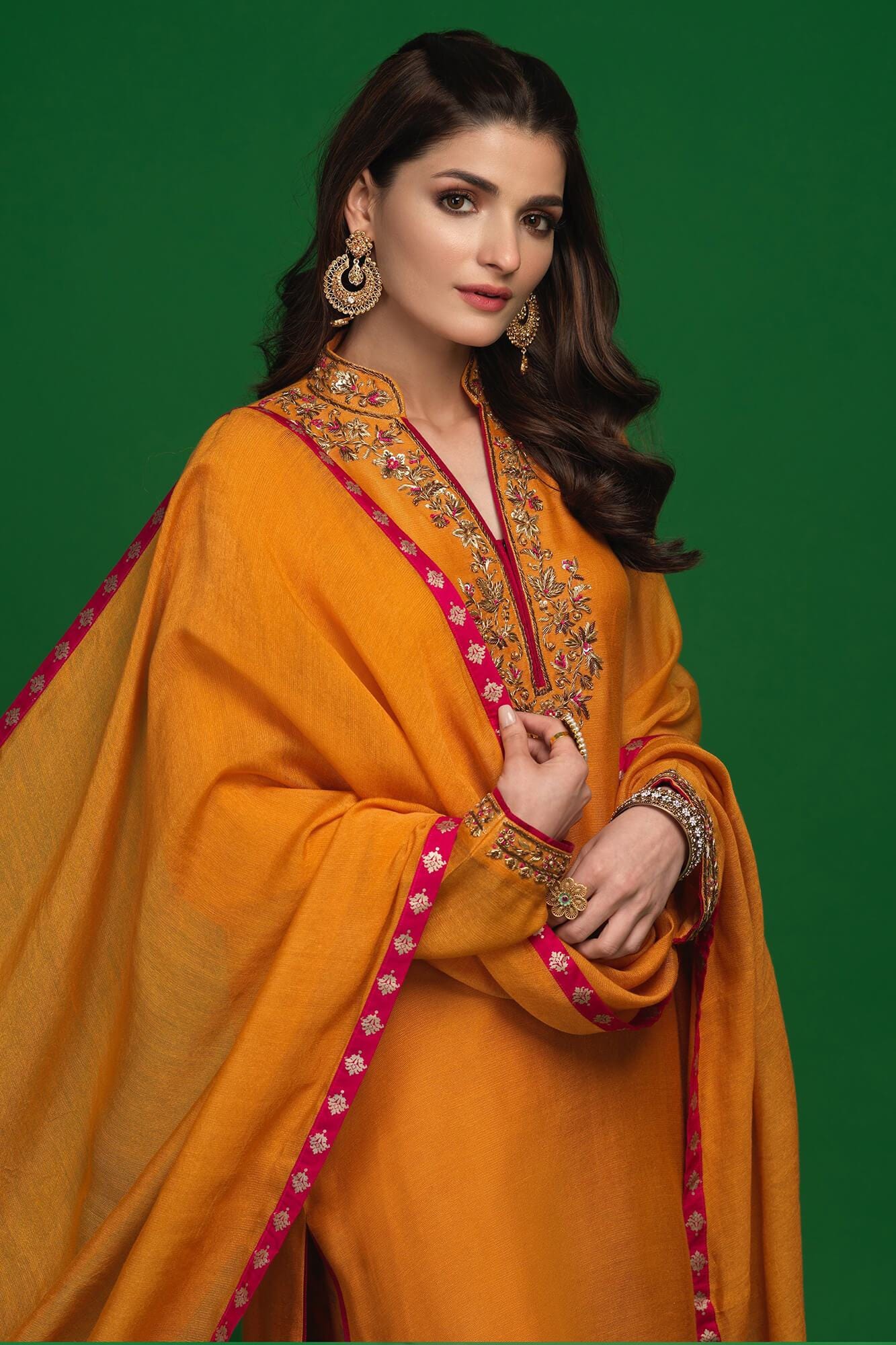 'Noorain' simple and sophisticated, it is an ochre khaddi net shirt adorned with hand craft of kora, dabka and resham with a sherwani collar. It is paired with a matching khaddi net dupatta with Zaaviay's signature screen print finishing, along with screen printed raw silk culotte.