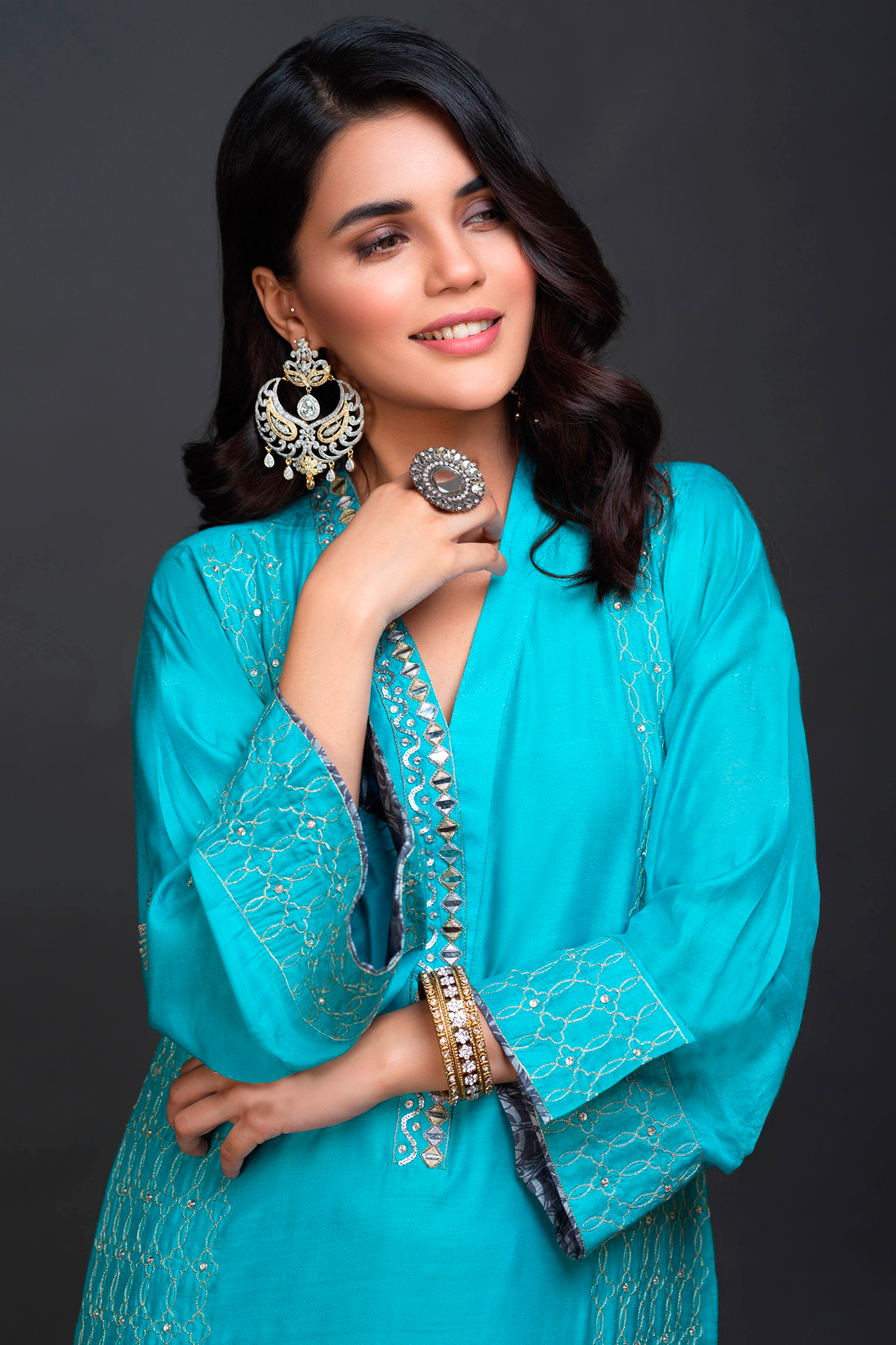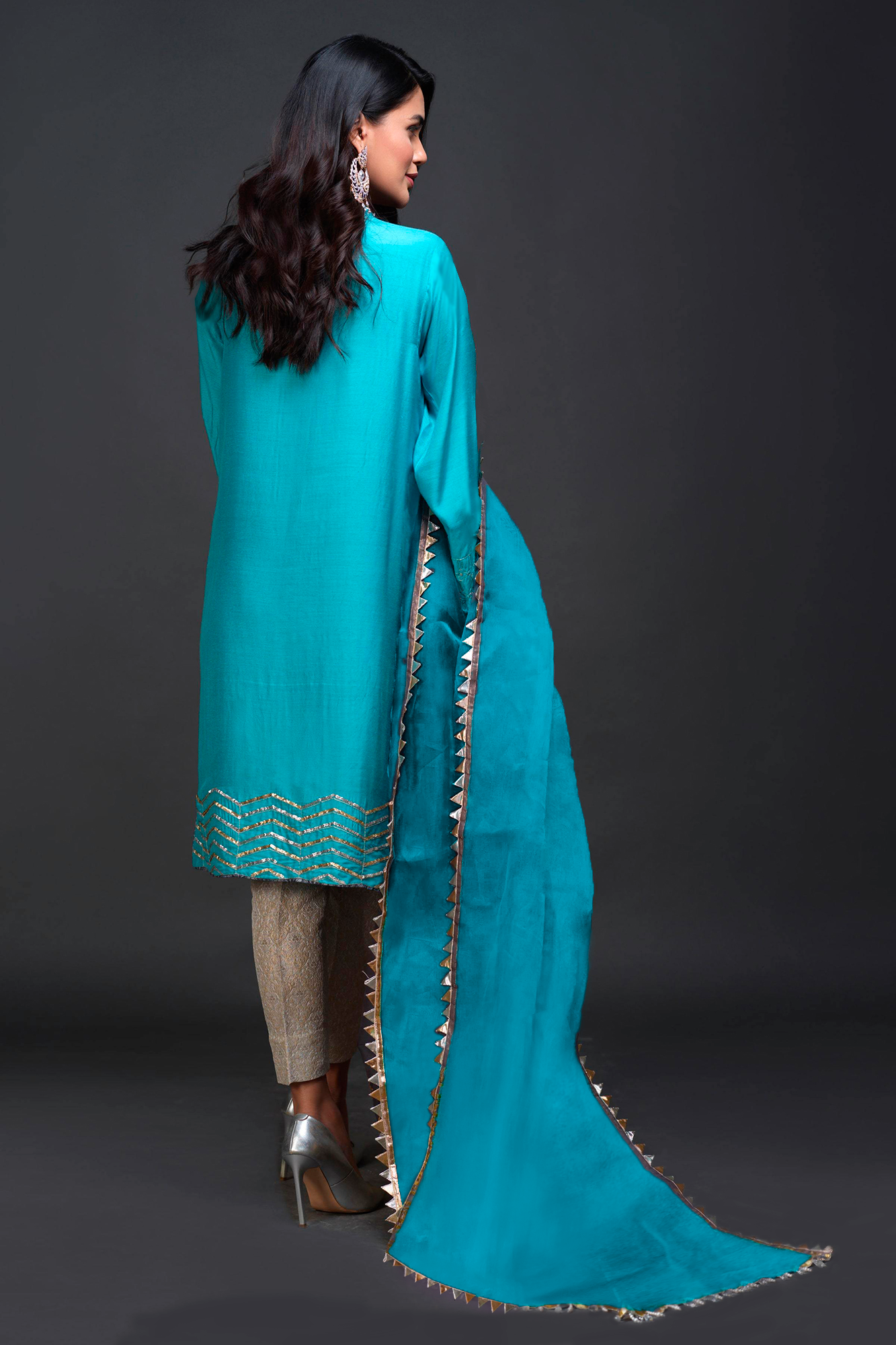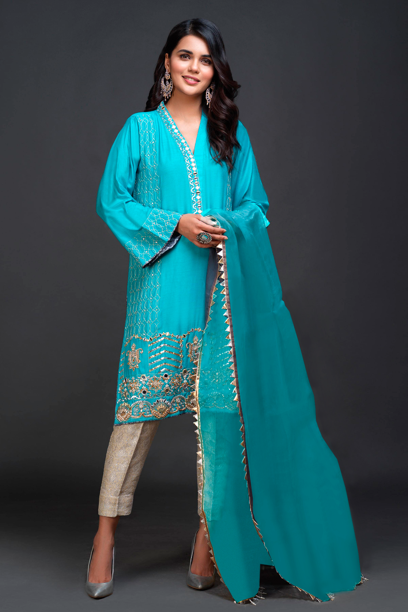 "Arsh" is an elegant corydalis blue Silk shirt featuring kora, dabka, aari, zardozi, zari, sheesha and gota work on front, neckline and sleeves with crystals. It is accompanied with our signature style organza dupatta.