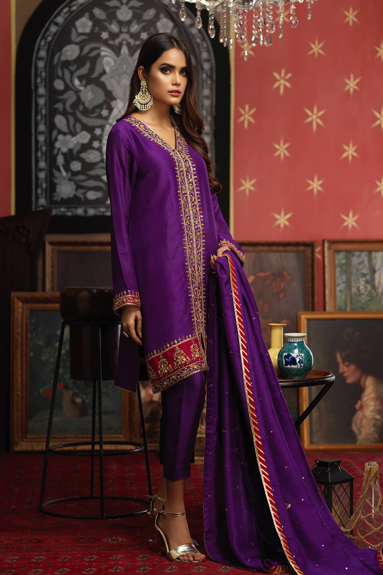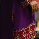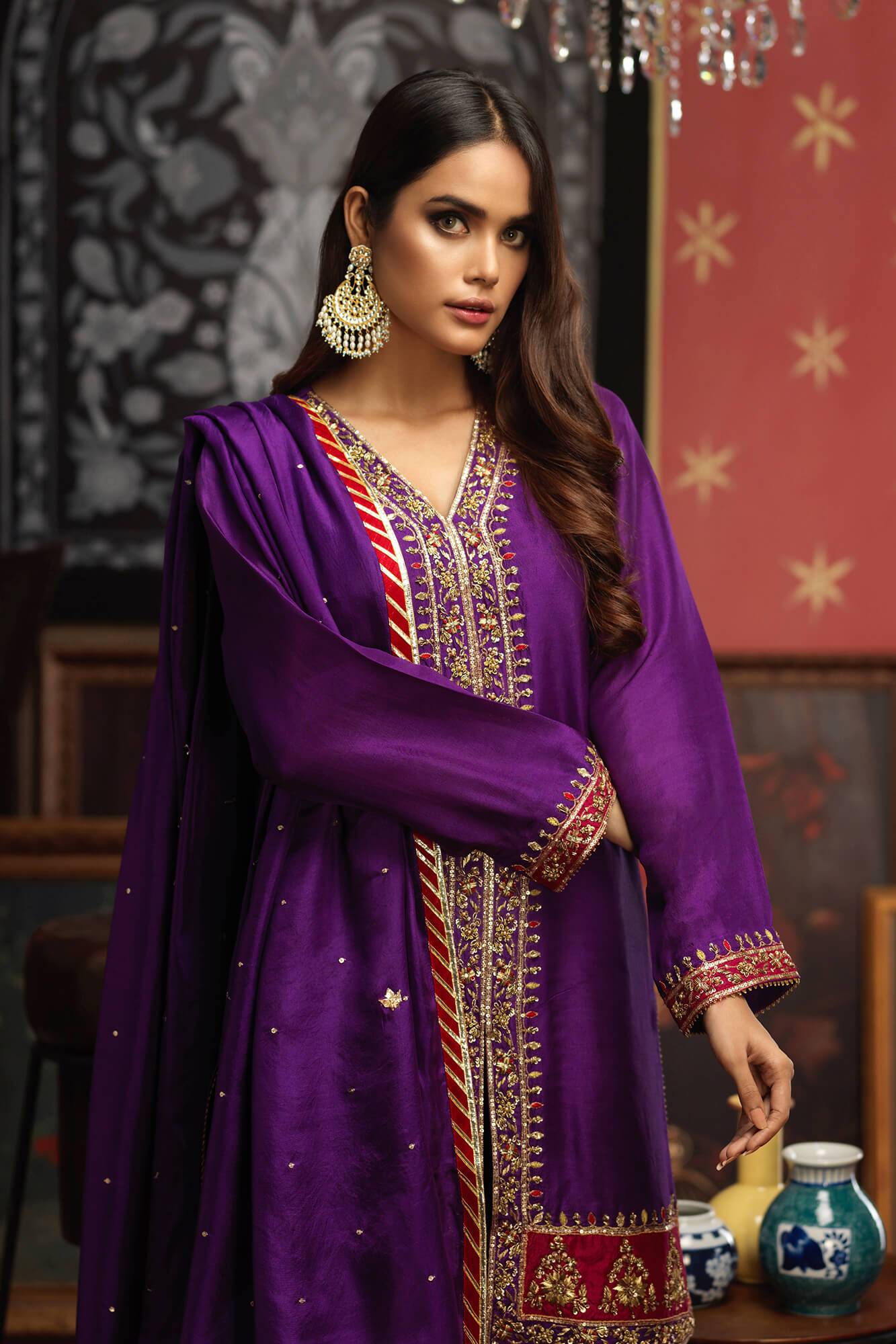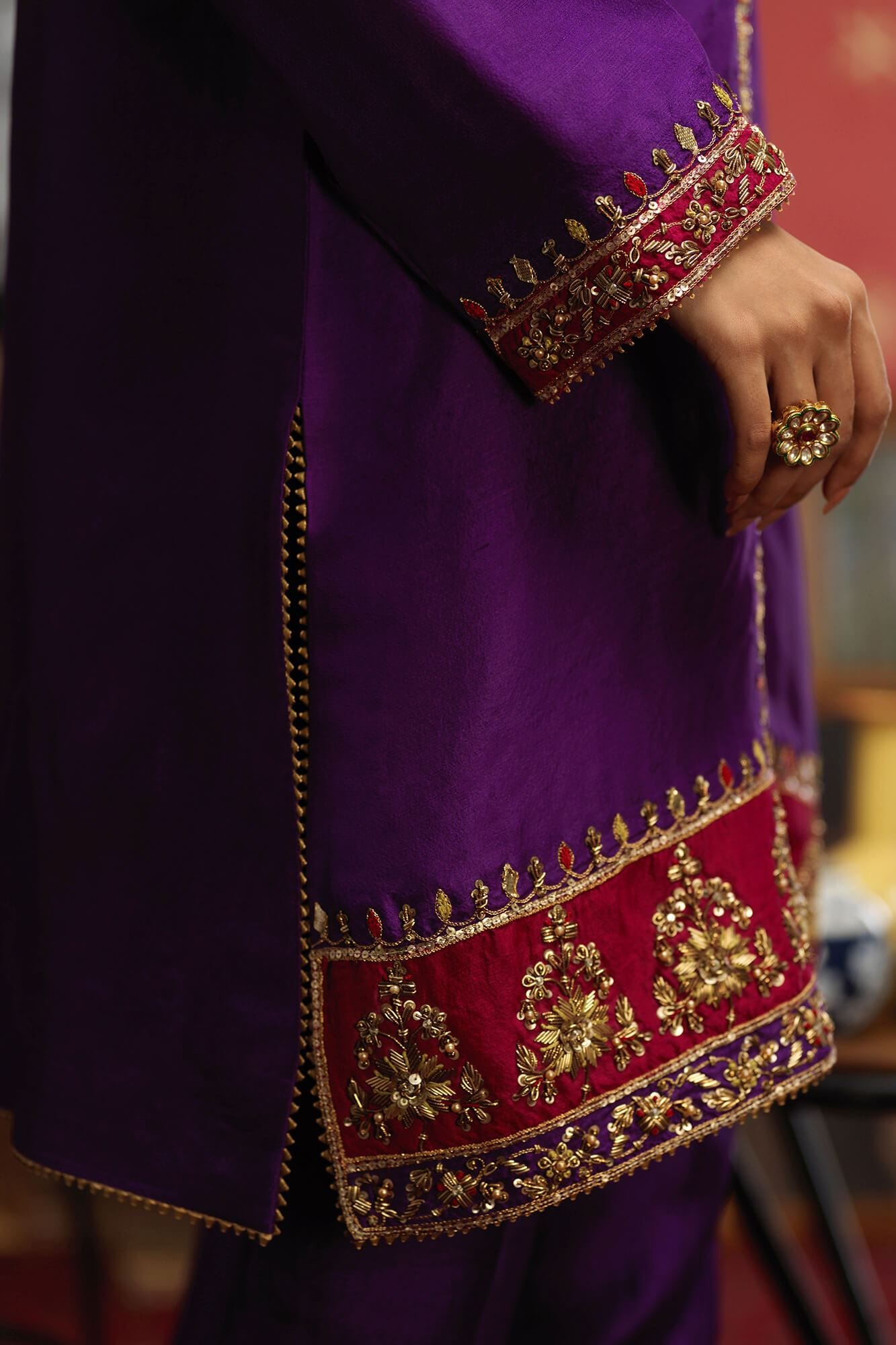 'Nehal' is a combination of tradition and modernity, a front open purple hue pk raw silk shirt embellished with detailed handcraft of gotta, resham, kora and dabka with an accent of red. Featuring with a matching pure silk dupatta with chann, finished with a red gotta lace. This article is perfect for the festive occasions.