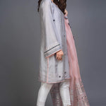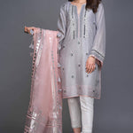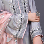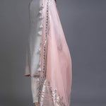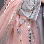 "Afsanah" is a revival of the traditional artisan work. A imported silk, opal grey shirt adorned with handcrafted mirrior work, aari, gota, kora, dabka and pearls with pure blush pink cotton silk, screen printed, hand hemmed finishing to enhance the shirt. For a more richer look, it is paired with a blush pink, pure organza, hand embellished silver foil screen print dupatta.