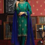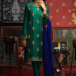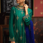 'Baria' a style statement with pk raw silk, A-line shirt with rich emerald green hue with detailed handwork of zari, zardosi, kora and dabka and slight bell sleeves, It is paired with a contrasting hand embellished sodalite blue dupatta, bringing a perfect blend of traditional and contemporary.