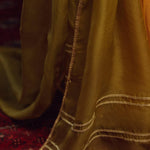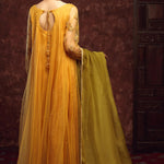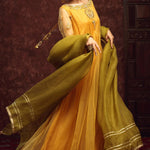 An ethereal sun glow yellow 'Chandbali' is a stunning kalidaar rendered on a delicate net fabric with accents of emerald green and champagne gold stones. It is embellished with jewel ornamented chandbali motifs and overall chan. It is paired with raw silk churidar and complemented with an olive green silk organza dupatta finished with gota details. This elegant design is a very chic look and perfect for any occasion.