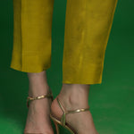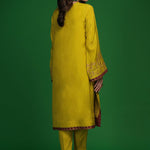 'Dhanak' a lime green, contemporary floral screen printed raw silk shirt accentuated with resham, kora, dabka and hand crafted buttons on the neckline. It is accentuated with screen printed finishing in an accent color. Paired with a net screen printed dupatta with finishing on all 4 sides along with raw silk straight pant.