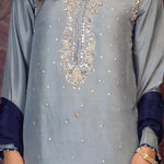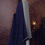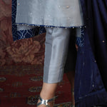 'Hoor' an impressive outfit with the tinches of silver embellishment on neckline and adorned with silver sequins on shirt to give a sparkling look. Contrasting color of blue and silver screen print is given for the finishing on neckline, sleeves and damaan. It is paired with a navy blue pure silk dupatta adorned with silver sequins adding color to the subtle attire.