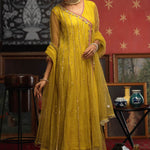 'Hoorain' a high class A-line lime green kalidar, incorporated with net fabric infused with heavy hand embroidery of kora, dabka, zaari ,aari and accent mauve color resham embroidery, the A-line kalidar is finished with Mauve and lace finishing on the hem, and tussle dangling finishing. It is paired with lime green net dupatta with chann and lace finishing on the four sides, a perfect ensemble for the wedding festivities. It is paired with pakistani raw silk churidar.