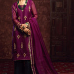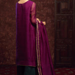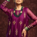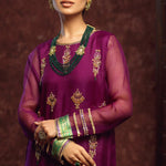 'Jhumka’ is a beautiful silhouette in the hues of purple, that is complimented with detailed embellishments on silk organza shirt with accented green stones, sequence and zardozi work. The look is completed by a contrasting green raw silk Dhaka pajama adorned with banarsi lace finishing. A matching silk organza dupatta is given to add finesse to the look, edged with banarsi laces and dainty detailing.