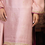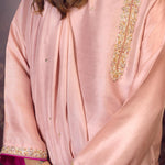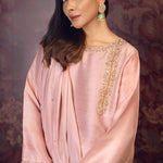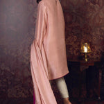 'Nazm' is breathtaking outfit with detailed asymmetrical embroidery with gold kora, zaari and dabka composed on round neckline with detailed embellished slit. To add a pop color to enhance the softness of base color, dark pink hue is added at the finishing on the sleeves and neckline. It is paired with pure silk dupatta with the hand embroidery on the edges to give it appealing look.