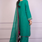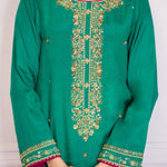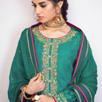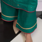 'Panna' is a beautiful bottle green ensemble in raw silk fabric with hand crafted neckline in kora, dabka, aari and zari with floral booti composed on the shirt with enriched hand crafted border on sleeves. A straight shirt is finished with accent pink color finishing and lace details, paired with raw silk same color izaar with pleats details on the paincha with gold lace insertion and finishing. It is paired with bottle green chiffon dupatta with chan and four sides accent pink color finishing with lace detailing and four sides enriched gold tussles.