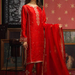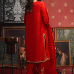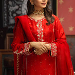 'Rahma' is an appealing red ensemble crafted with ivory embroidery, glittering with delicate kora, dabka, zarri and gotta work on the long neckline and sleeves with hand embroidered motifs. The pk raw silk shirt is paired with two toned dupatta that is terracotta and red with finishing lace on four sides making it a perfect outfit for wedding festivities.