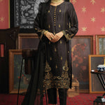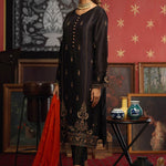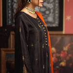 'Rizah' is a beautiful black embellished shirt enriched with high quality pk raw silk with intricate handcraft of gotta, zari, resham, kora and dabka, paired with matching burnt orange contrasting pure chiffon dupatta with chann and pom pom tassels finishing on dupatta hem, perfectly adorned for festive wear.