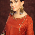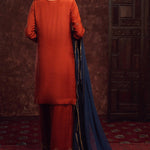 'Sunsitara' is a raw silk infused with gold and copper hand embroidery with a touch of applique in blue color in contrast. The most versatile shade makes this outfit your ultimate solution to all occasions. It is paired with exclusively designed raw silk Izaar with detailed and intricate hand embroidery. Additionally, the chiffon dark blue dupatta with laces beautifully adds to the outfit.