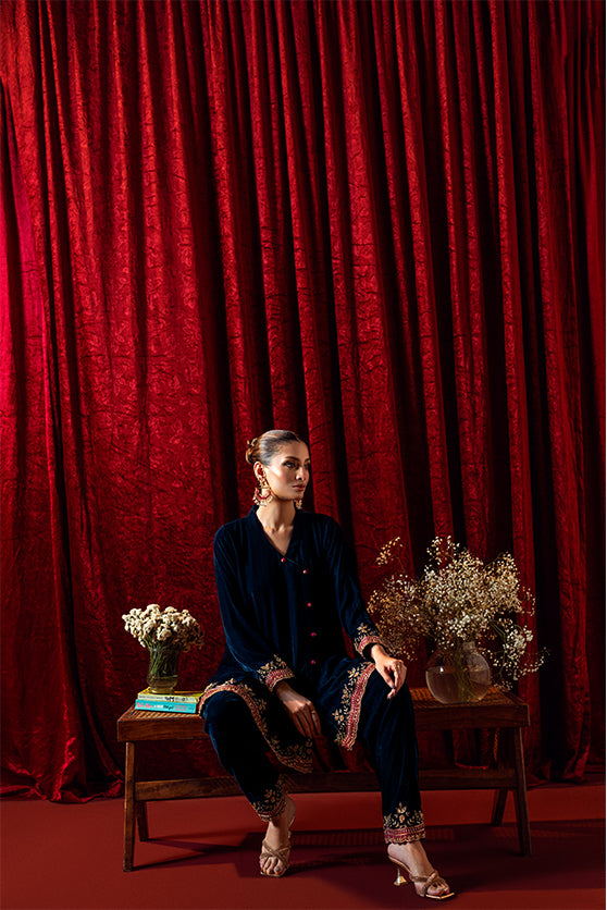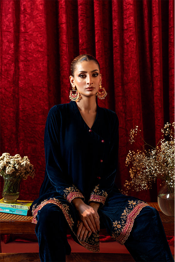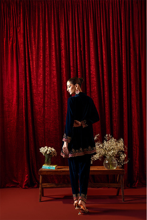 ''Dewdrop'' This elegant and graceful, teal angrakha  with hand  embroidery intricate  with dabka, kora, sequence , pearl work. Its pair with matching fitted shalwar with hand embroidery.