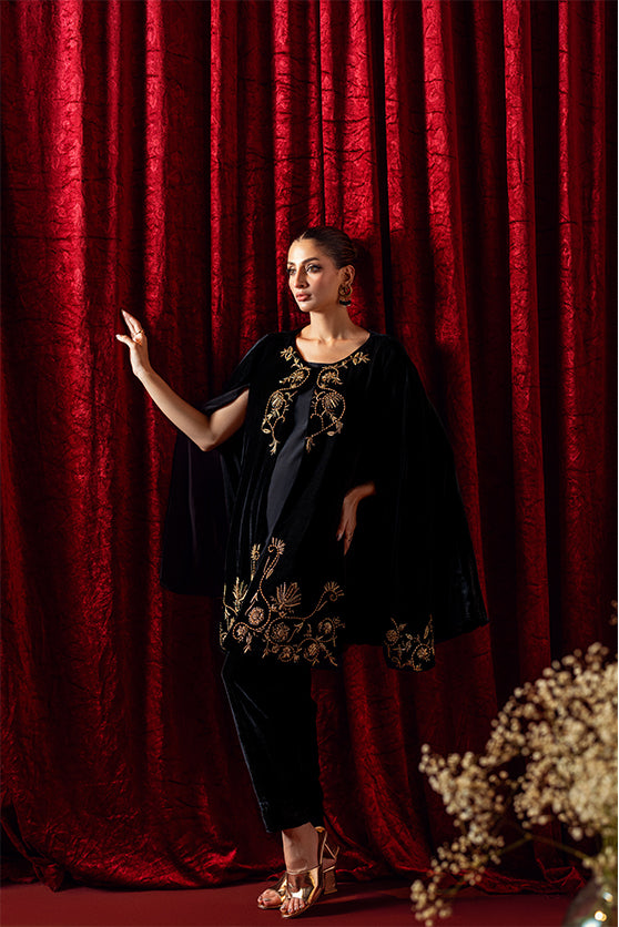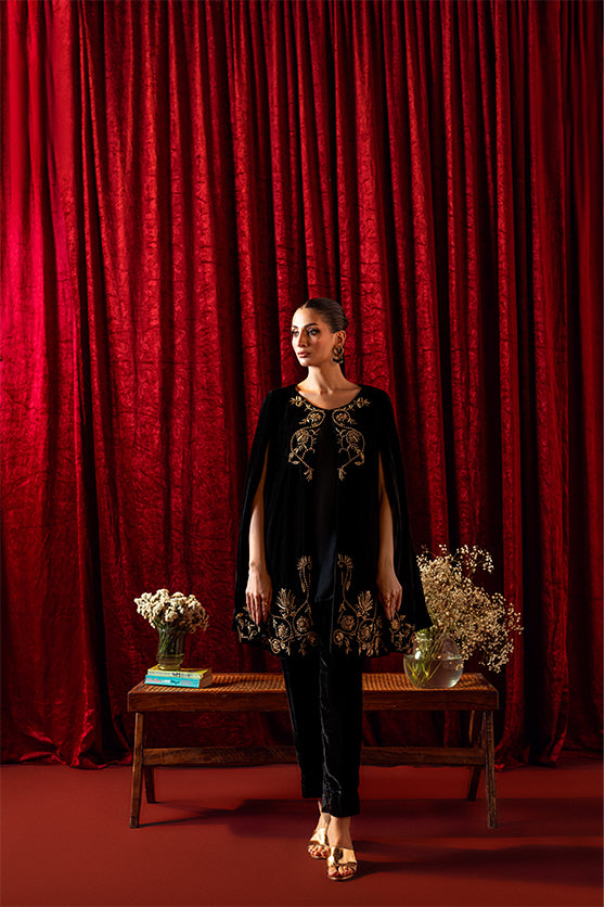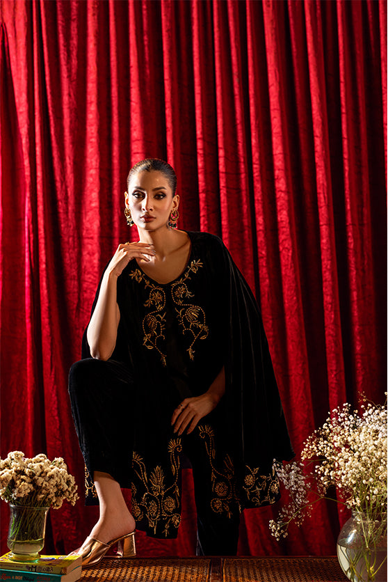 ''Night Blossom'' It is an epitome of elegance. It's a velvet black cape with hand embroidered has intricate, dabka, kora, sequence, pearl work. It is paired with matching straight pants and a silk inner.
