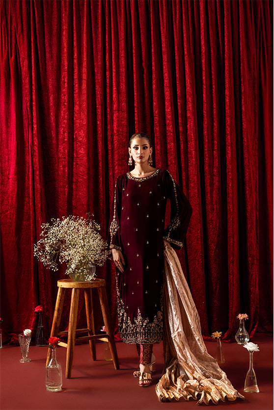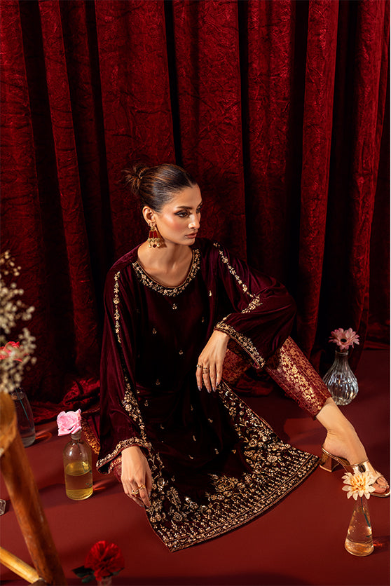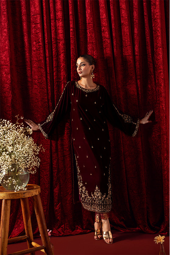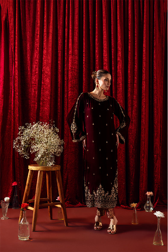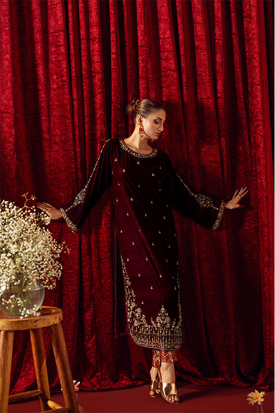 "Warm Chestnut'' It is a long silhouette velvet shirt in a gorgeous maroon shade featuring handcrafted ,intricately adorned with kora, dabka zari and aari, pearl, sequence. The shirt is paired with banarsi straight pant. You can also pair it with maysuri crushed dupatta.