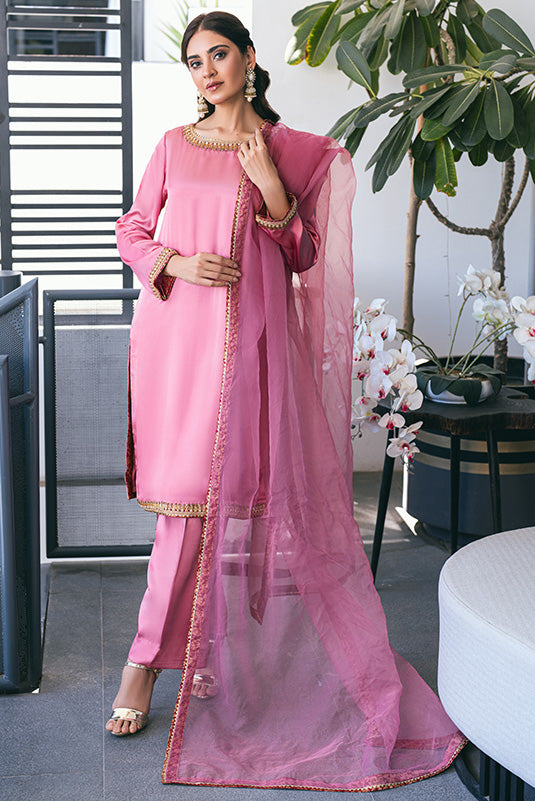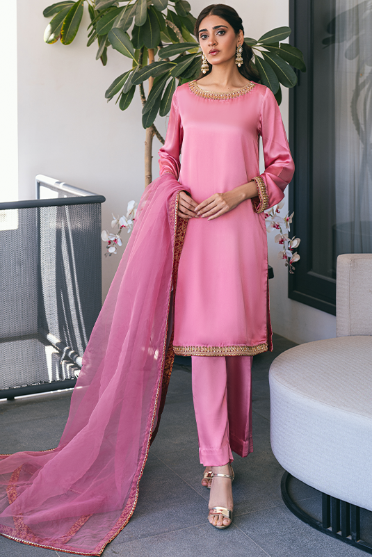 "Lujain" is a shamos silk straight silhouette in pink colour. The front has intricate work of kora, dabka, sequins, crystals and pearl work. It is paired with matching straight pants and organza duptta with lace trimmings and banarsi finishing.