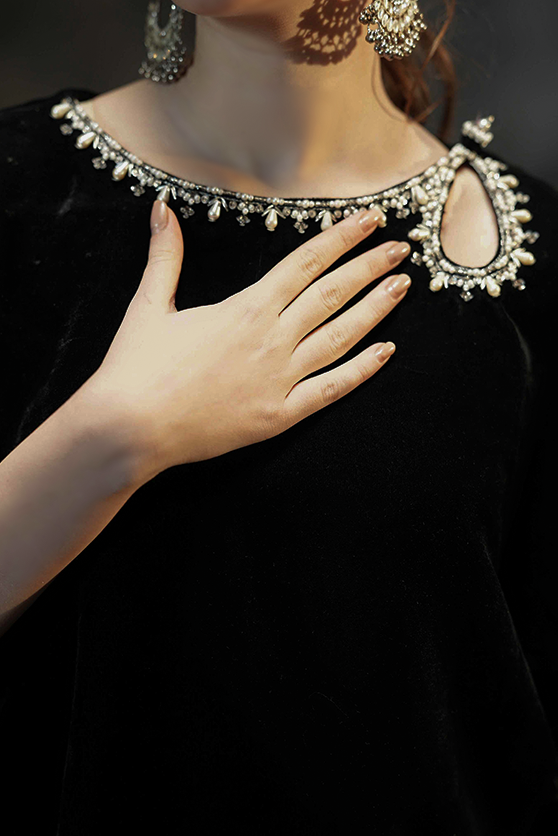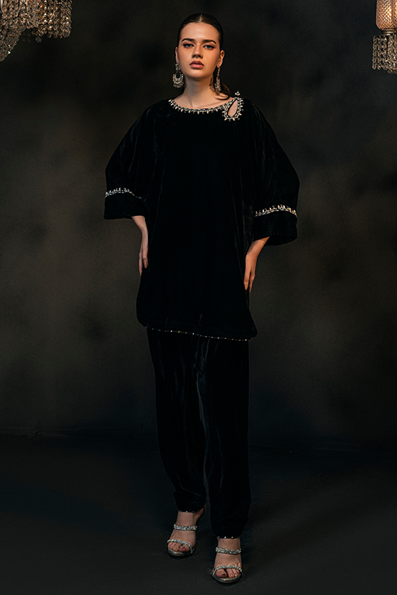It is a modern silk kimono sleeves cut with round daman and keyhole adorned with intricate hand work of kora, dabka, zari, sequence, pearl and cut dana. It is paired with the matching fitted shalwar with gota lace finishing.