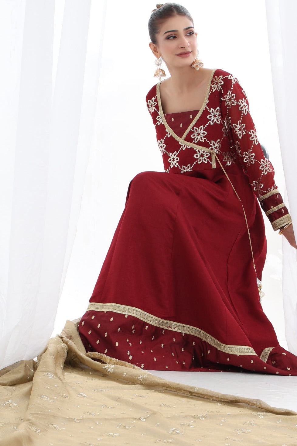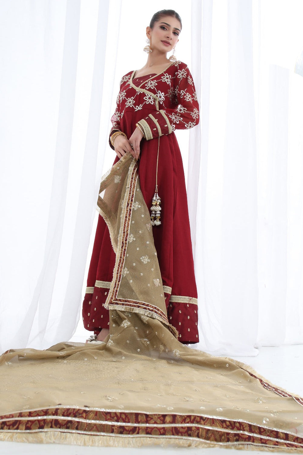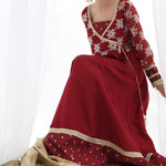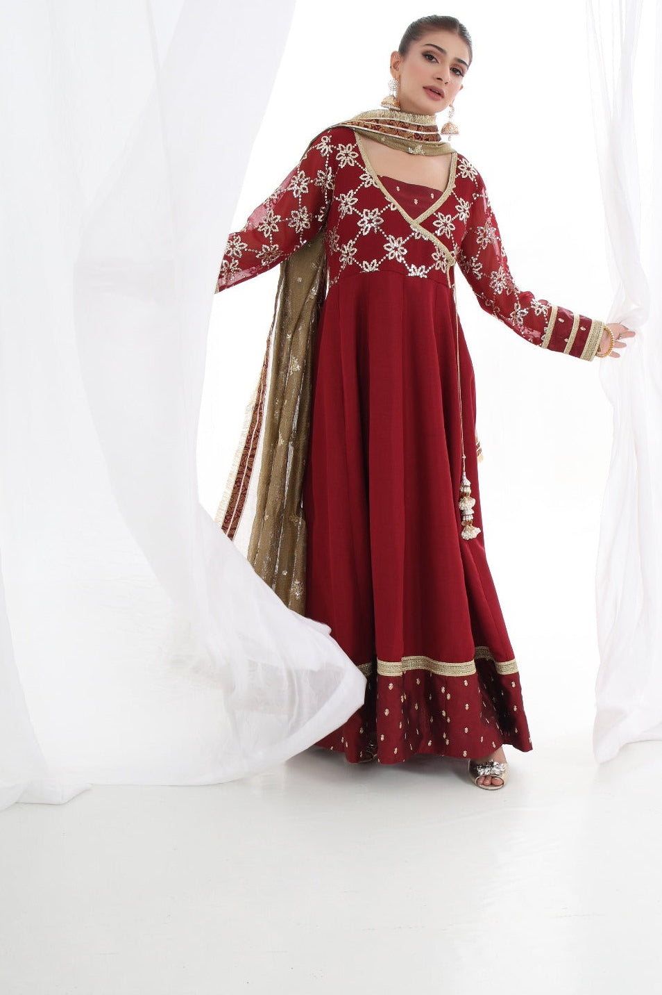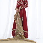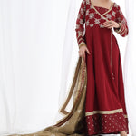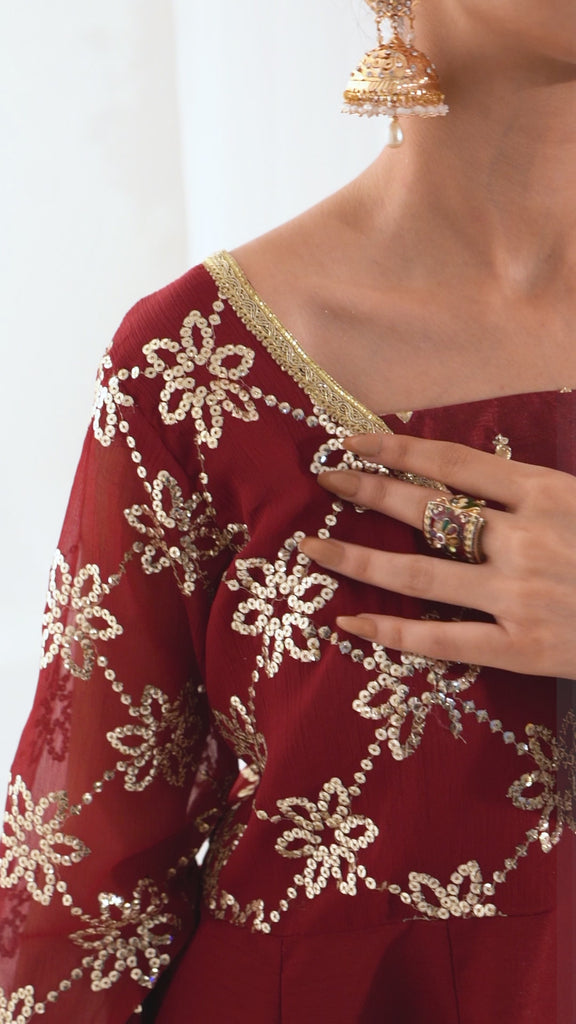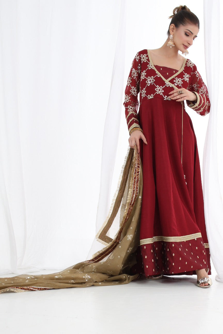A stunning chiffon Chikankari peshwas with overall embroidery and sequins work, featuring a rich velvet border on the frock, paired with an olive green contrast chiffon embroidered duppata, perfect for making a statement at festive occasions and special events.