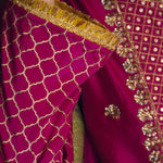 'Deeba' a definite ready to wear for the festive wardrobe. A straight line magenta shirt, alluring in pk raw silk fabric with geometrical hand crafted neckline, incorporated with kora, dabka, aari, zaari. Sleeves are screen printed with accent lime green finishing on sleeves and shirt hem. It is paired with a pure silk dupatta with screen printed borders and edging lace to give it a elegant look.