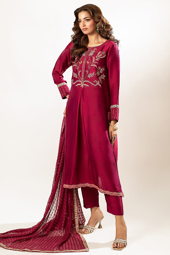 Shine in this regal magenta outfit, adorned with intricate embroidery on the bodice and sleeves. The long, flowing silhouette is paired with a fully chickenkari dupatta, adding drama and elegance to the look.