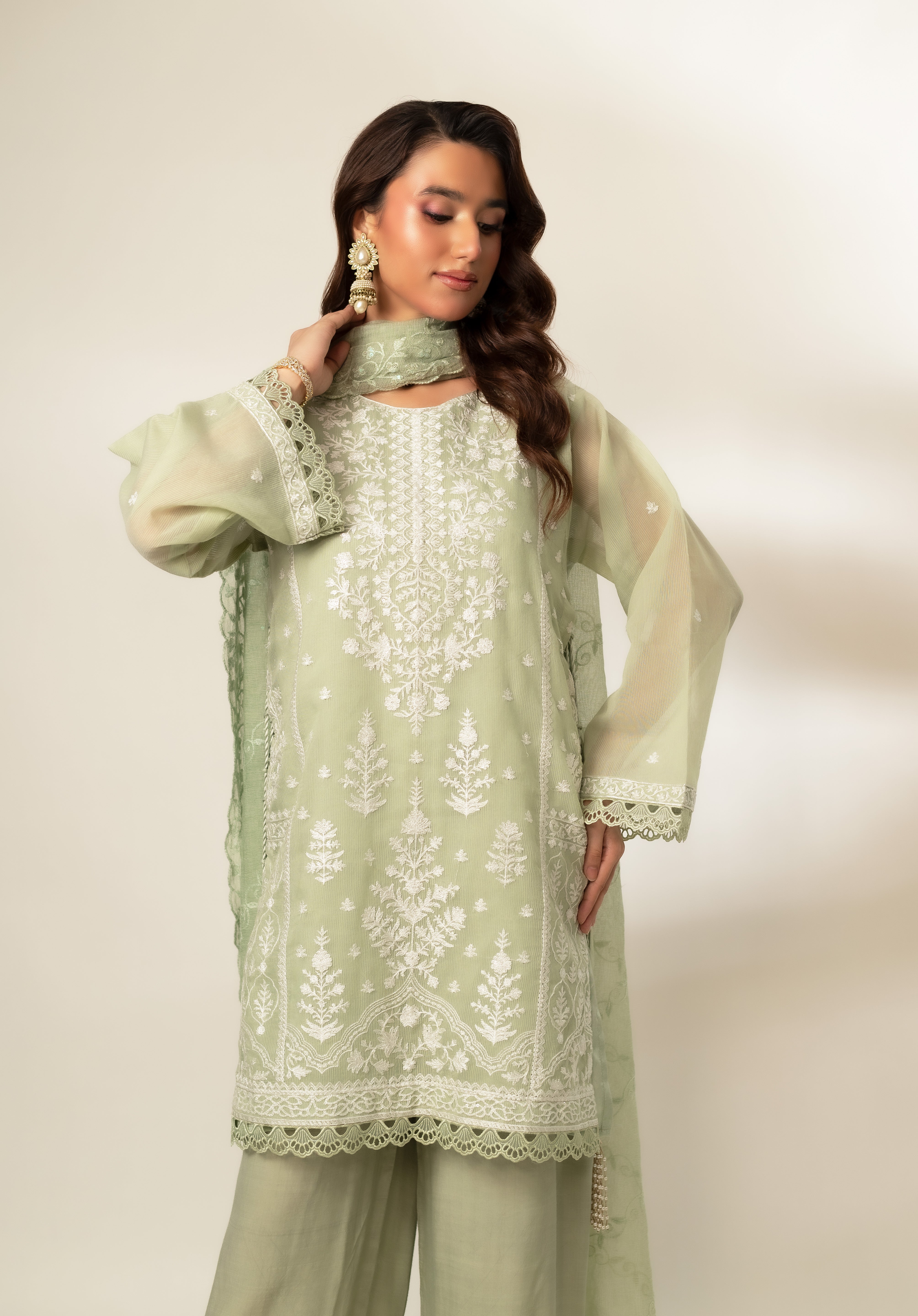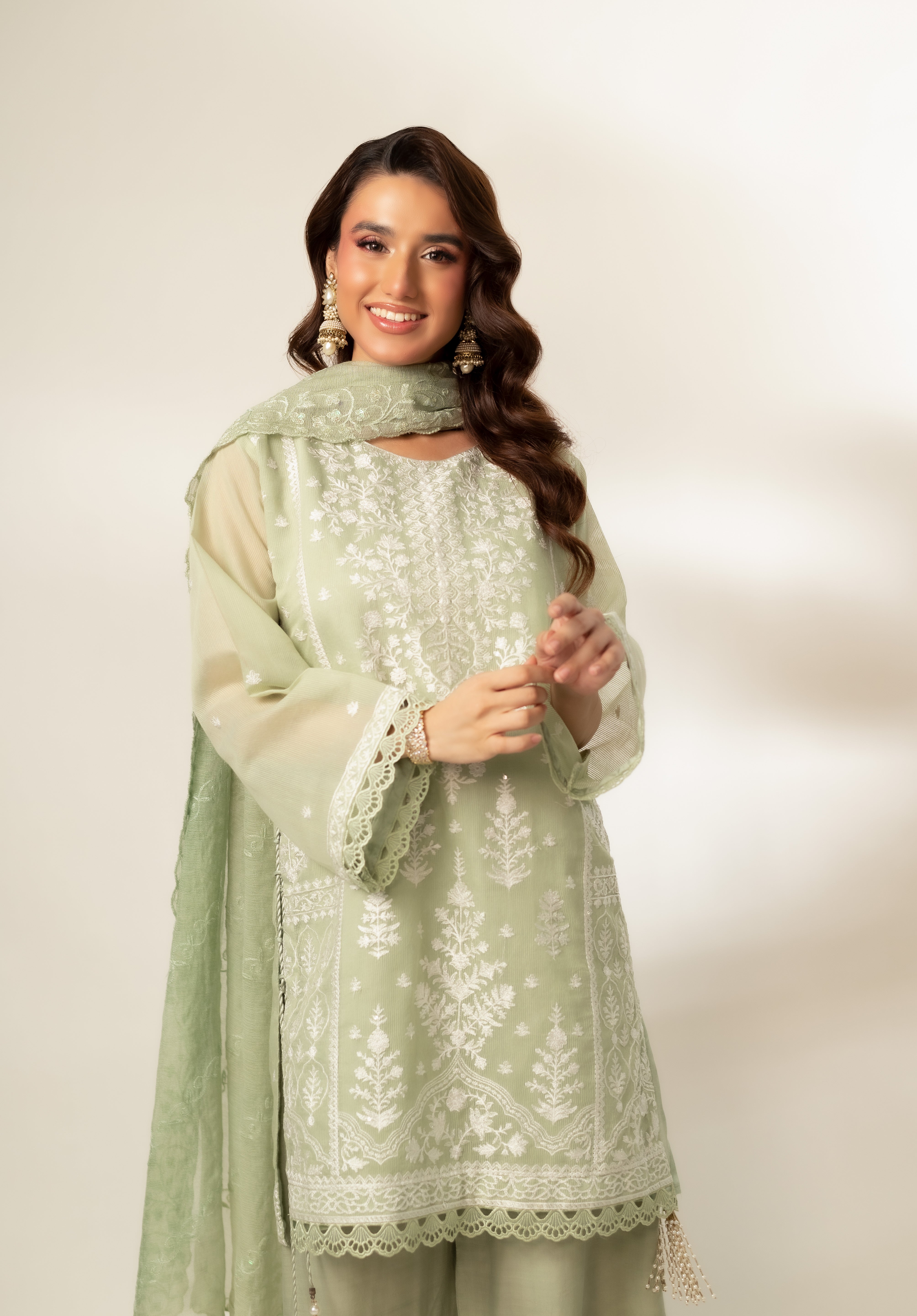 Soft, soothing, and sophisticated, this pastel green traditional outfit features intricate embroidery and delicate embellishments. The tassels on both side slits of the shirt add elegance, while the flowing dupatta with embroidered borders exudes grace and sophistication, perfect for festive or special occasions.
