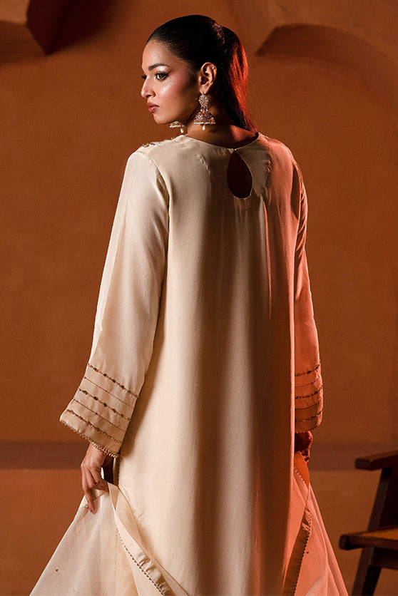 Make a statement in our ivory ensemble, showcasing intricate hand embroidery with gota, zari, sequins, pearls, and cut dana work. The long shirt pairs elegantly with an izaar featuring delicate lace detailing and an organza dupatta with chan work and fine golden edging.