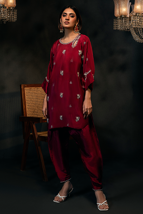 It is a sophisticated kimono sleeves cut with round daman and keyhole neckline in raspberry color adorned with intricate hand work of kora, dabka, zari, sequence, pearl and cut dana. It is paired with the matching fitted shalwar with gota lace finishing.