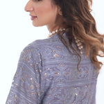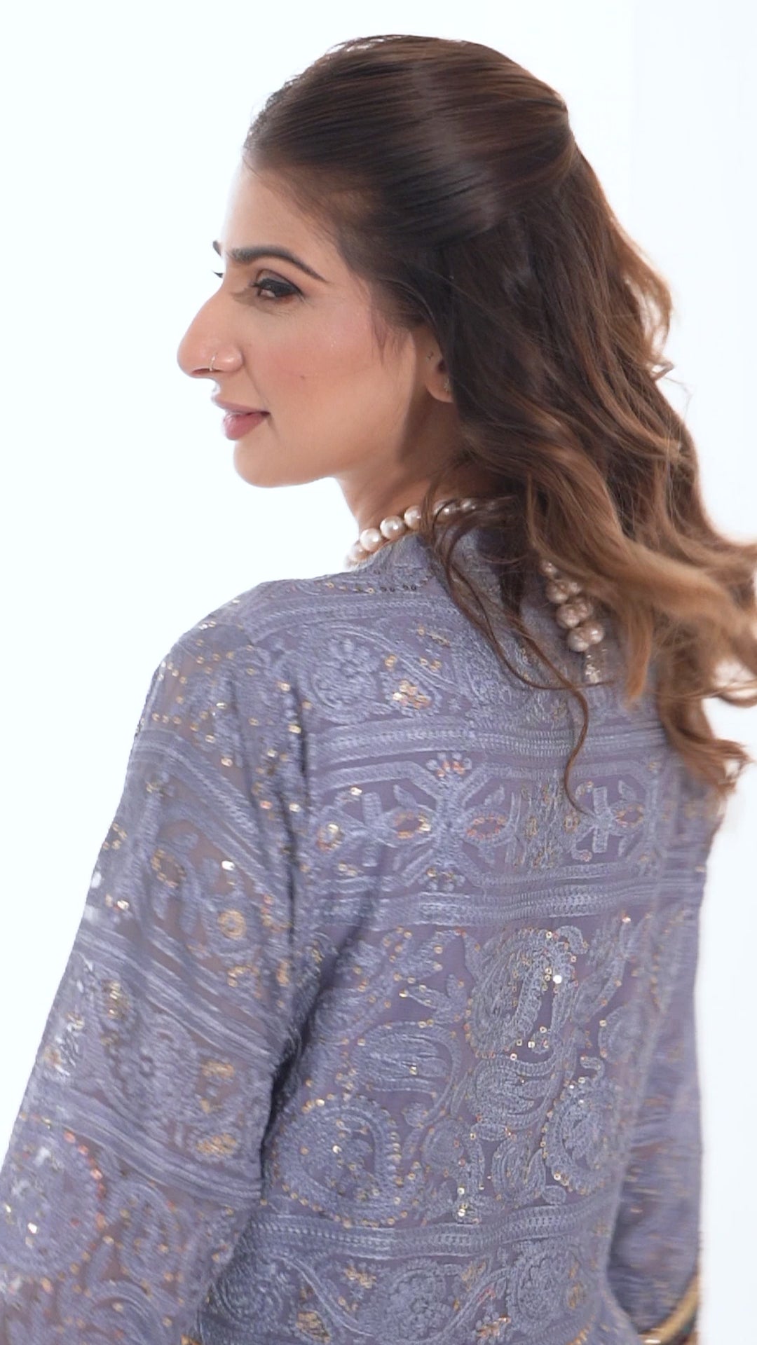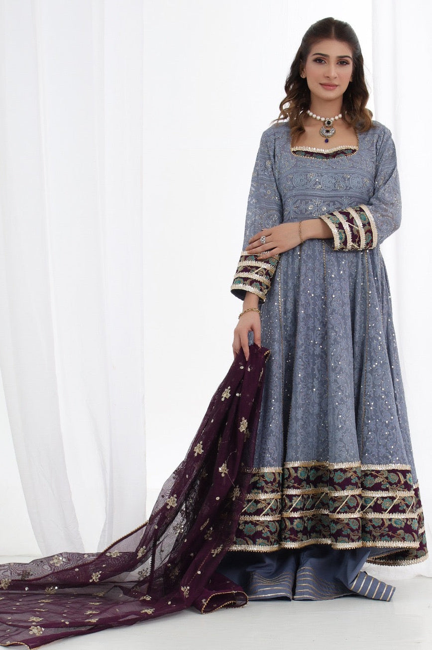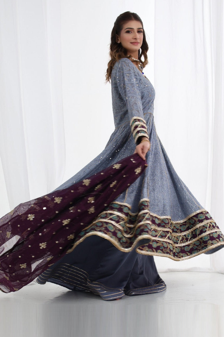 Lilac Whispers is a beautiful chiffon Chikankari peshwas with overall delicate embroidery and a stunning jamawar dramatic border on the neck and frock, paired with a matching lilac sharara with gota finishings. The chiffon embroidered duppata completes this elegant outfit, perfect for festive occasions and special events.
