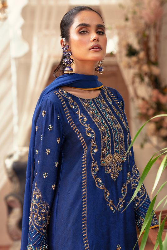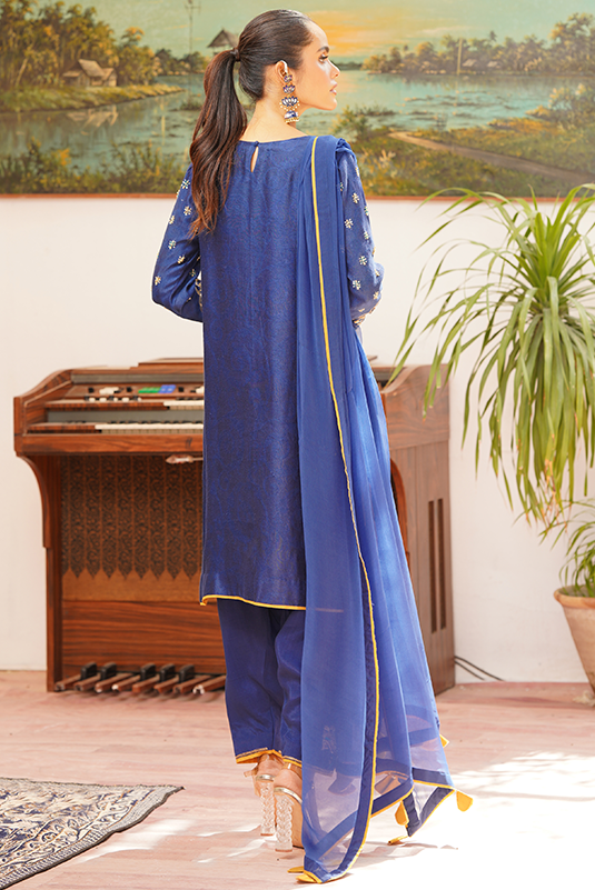 'Deniz', a same colored outfit which stands out in this blue jacquard straight cut shirt with persian themed hand embellishment done with zari, colored kora, dabka, sequin. The matching pk raw silk shalwar is made with hand embroidered motif and the chiffon dupatta is finished with handmade samosa tassels. The entire outfit is finished with ochre yellow finishings.
