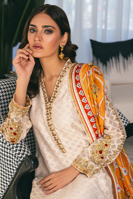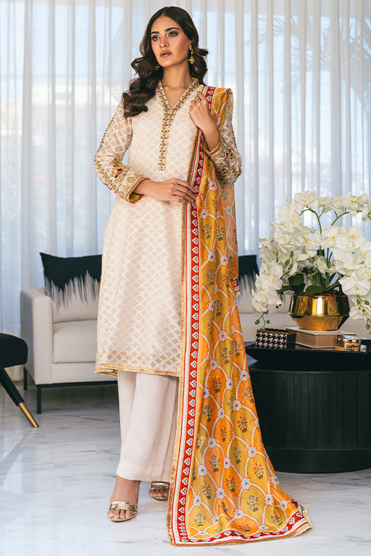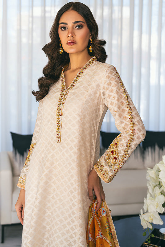 "Dia", a beautiful Ivory cotton net paneled a-line kurta. The neckline and sleeves adorned with dabka, resham, sequins and pearls work. Sleeves and hemline are finished with lace trimmings. It is paired with a matching pk Raw silk izaar and printed duptta with lace trimmings.