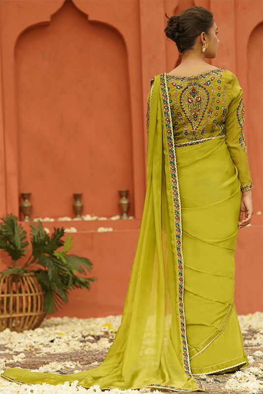 Gul e chandni is a tissue silk saree that comes with intricate embroidered border in hues of magenta and teal finished with gold laces in hues. It is complimented with a matching blouse in raw silk with handwork at the back and sleeves.