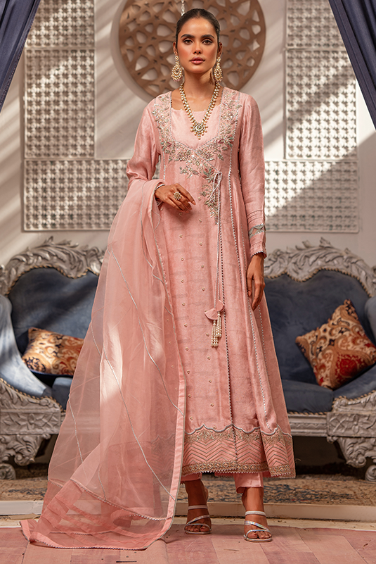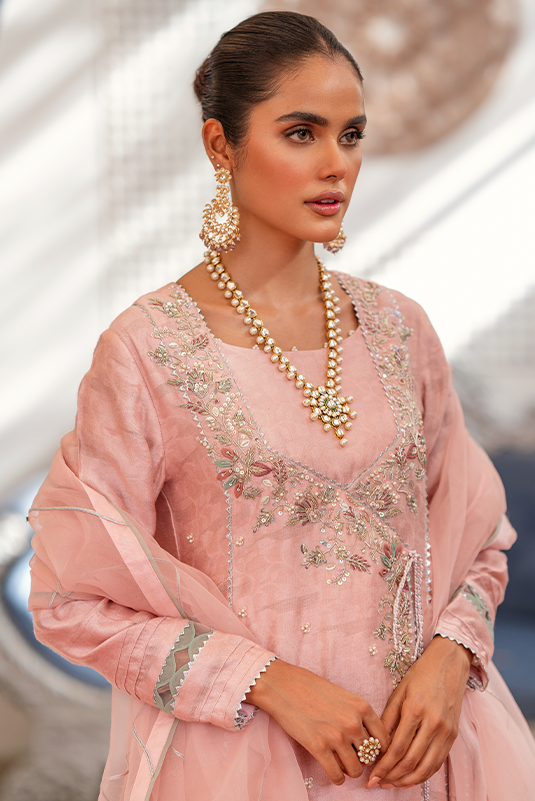 'Guzel' is a blush pink jacquard angrakha which has an intricate hand worked neckline with 3D organza petals and fancy hand made pearl tassels. The front has sequins and pearl chann. It has an organza embroidered border all over. Sleeves has organza scallops and lace details. It is paired with pk raw silk pink straight pants and an organza dupatta with fancy border and details.