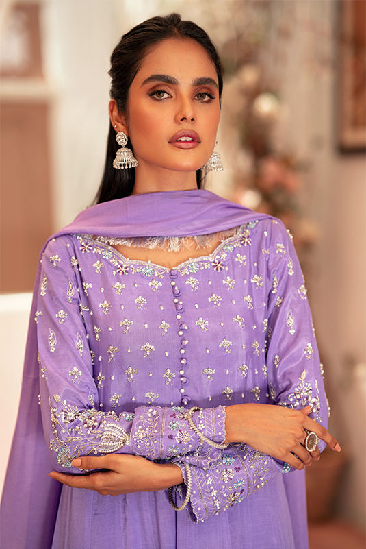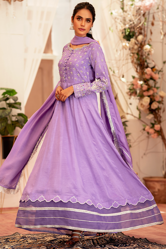 'Mayumi' lavender pk raw-silk peshwas features intricate hand embroidery on the bodice. Scalloped neckline, embellished buttons and pearls on center front. The hem is adorned with scallops along with an organza border. The ensemble is paired with matching pk raw silk straight pants and a tissue silk dupatta, decorated with a lace border.