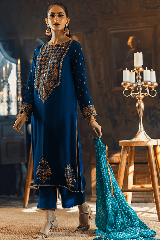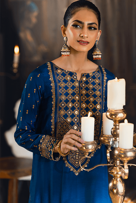 "Meesha" is a Pk raw silk long royal blue straight shirt with an hand embellished and screen-printed neckline, with full sleeves. Both are intricately adorned with kora, dabka, zari, crystals and contrasting green embroidery. Gota lace is added to finish the sleeves. To complete the look it is paired with blue pants, which are finished with lace. The dupatta complimenting this is a tissue silk light blue piece.