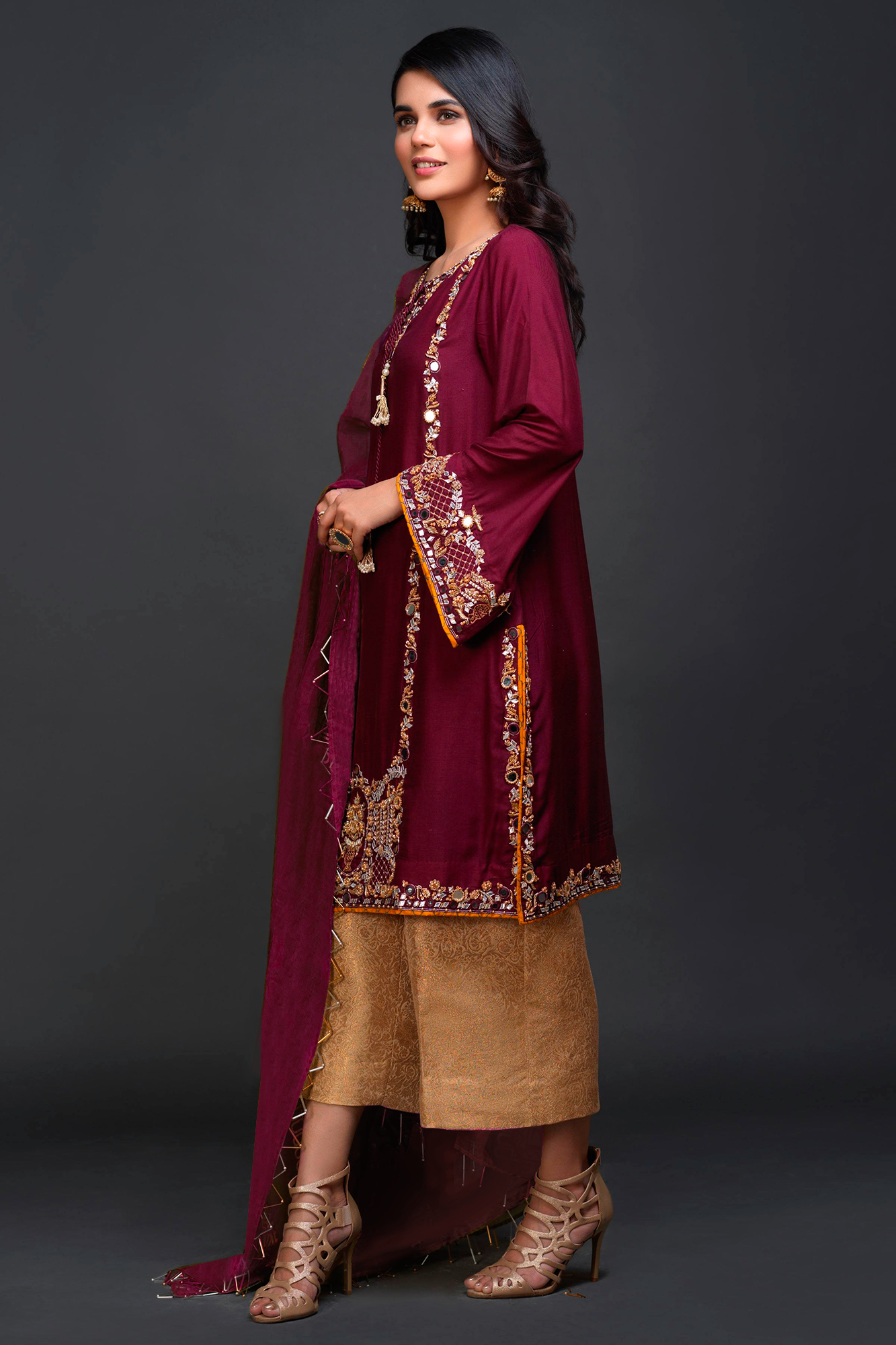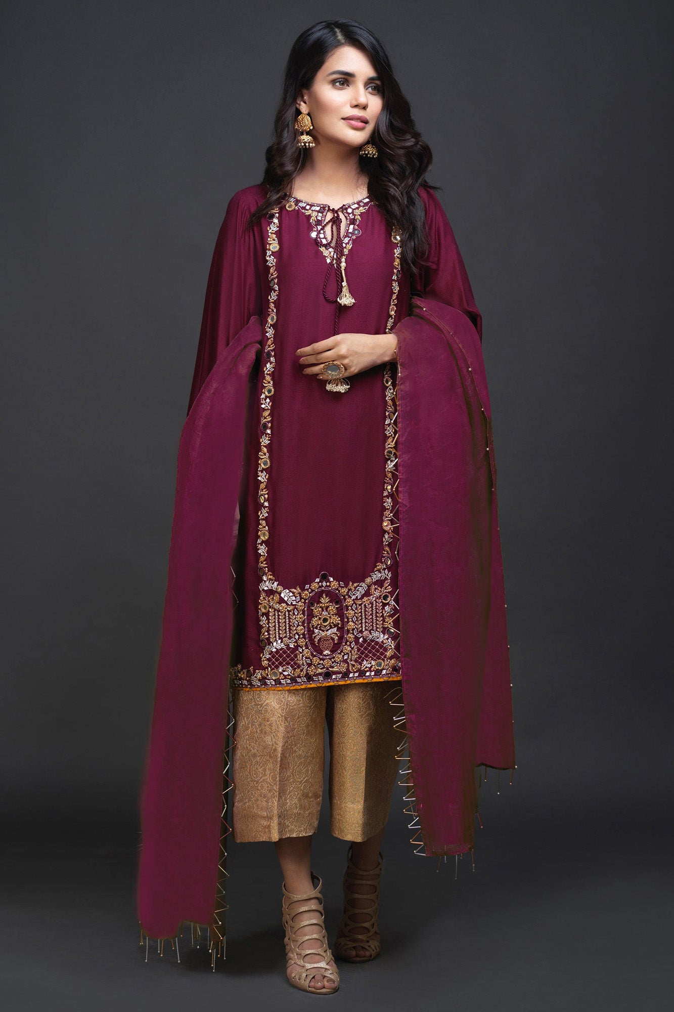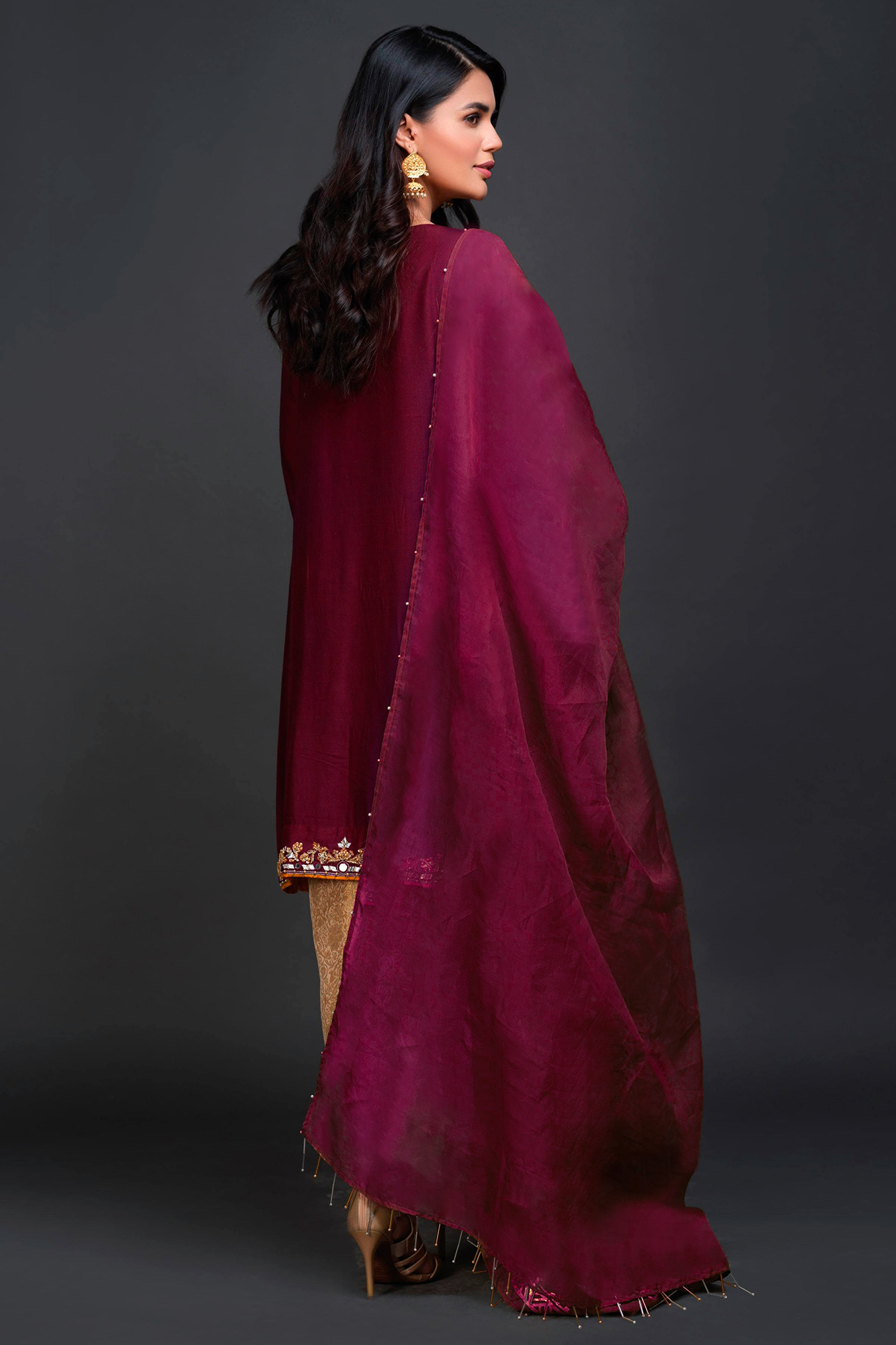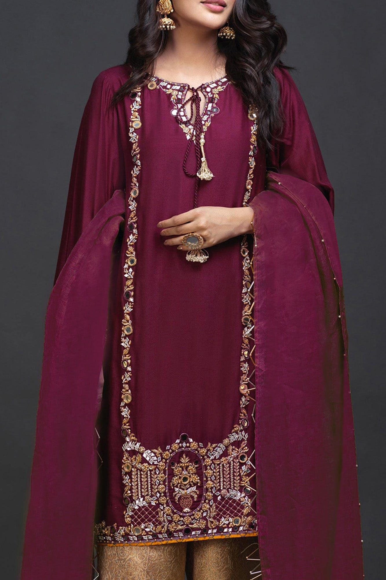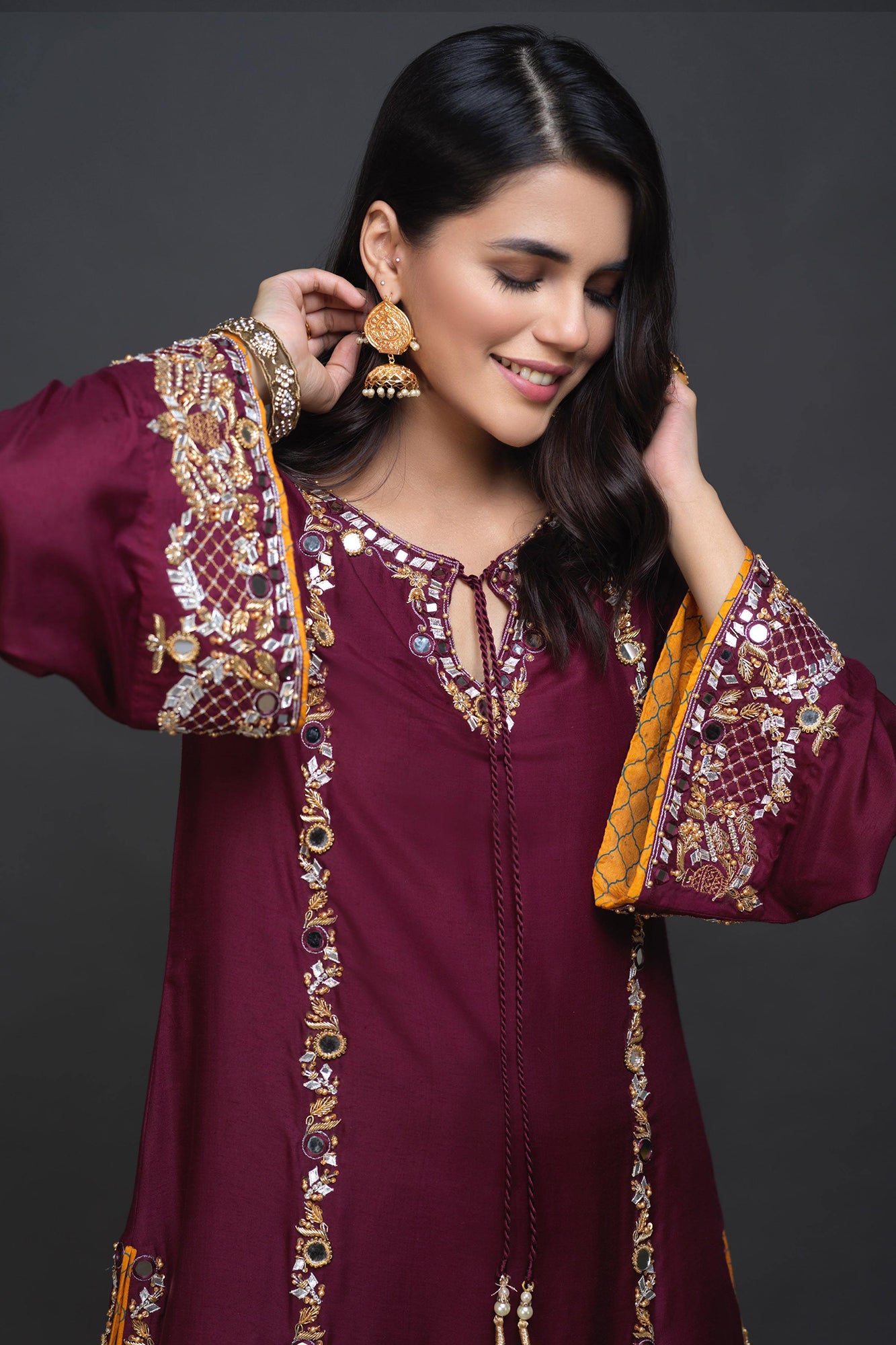 An elegantly crafted design, “Nayab” is rendered in a plum Pk raw Silk shirt with exquisite handcraft, featuring kora, dabka, aari, zardozi, zari, sheesha and gota work. Styled with a round neckline consisting hand crafted dori tassel and heavy borders on the sleeves and daaman. It is paired with a plum style organza dupatta with pearl finishing, a perfect ensemble for festive events and evening soirees.