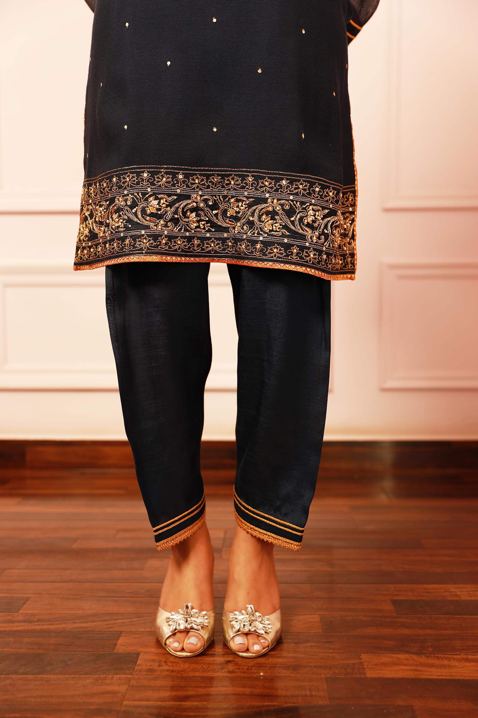 Neela is a deep ink blue khaddi net kurti with a detailed handcrafted gold border on the daaman and decorated brooches on the neckline, along with delicate chan overall. It is paired with a similar coloured PK raw silk shalwar which is adorned with deep gold laces on the hems.