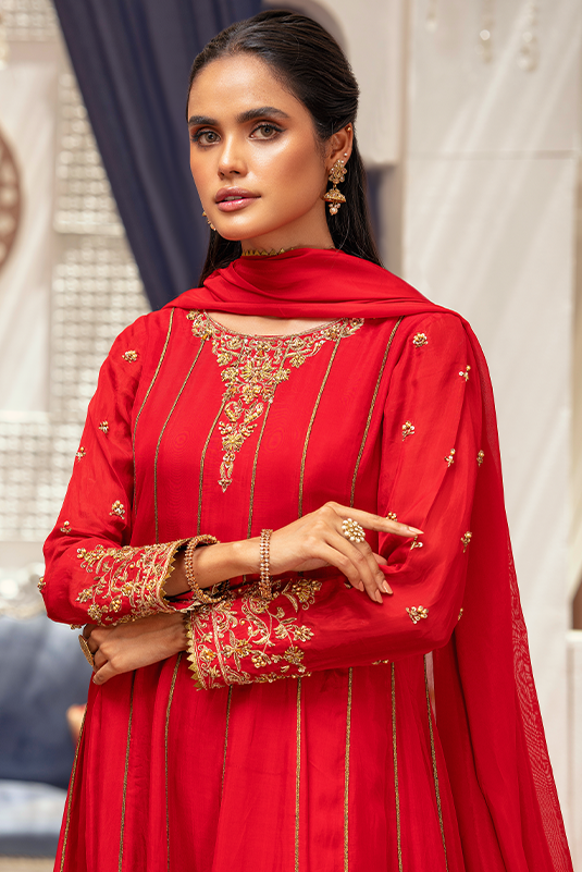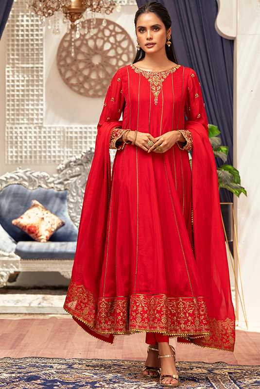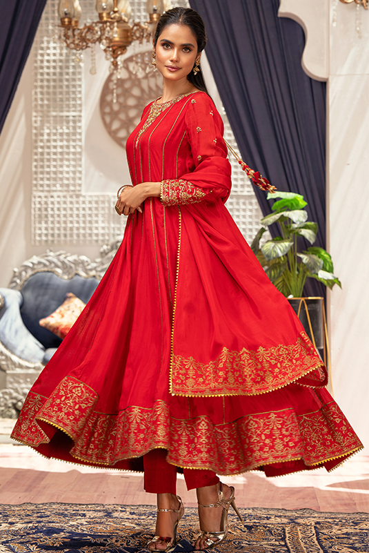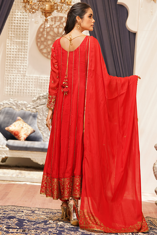'Nia' is a red Pk raw silk kalidar that is deftly adorned with floral imagery, rendered in tilla, dabka and resham on sleeves and neckline. The ensemble is finished with screen printed border in gold. The outfit is paired with straight pants and silk dupatta finished with copper lace.