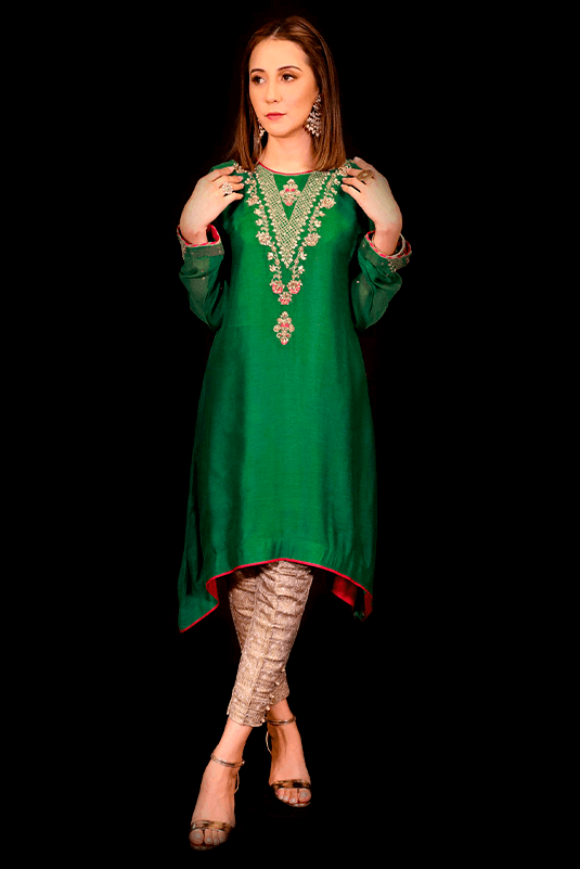 Rang is a bright green dropped daman kurti in khaddi net with detailed handwork of zari, sequins, kora, dabka and pink accented resham. This kurti is finished with a hot pink gota lace.