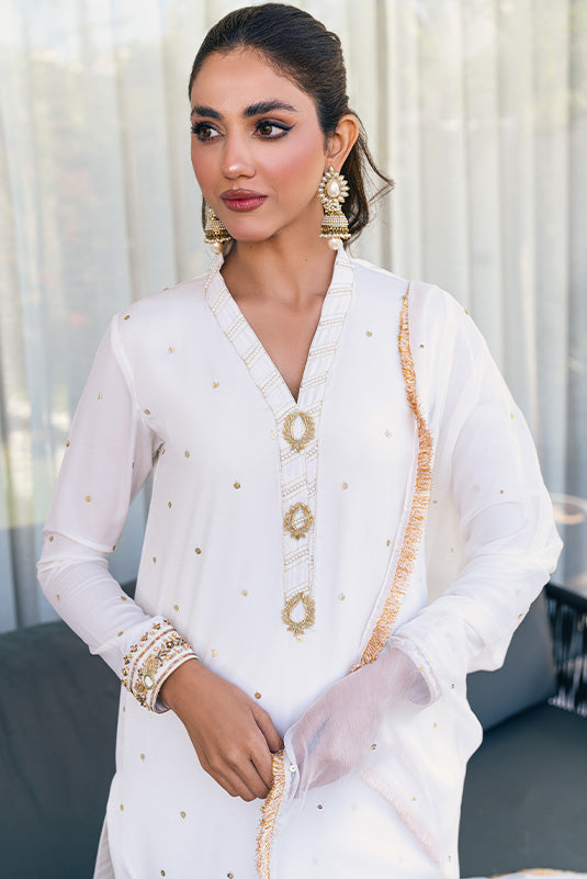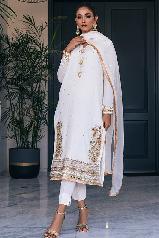 "Riha" is an epitome of elegance. It's a crepe silk, white colour long shirt. Front of the shirt has intricate gota, dabka, kora and mirror work. Hemline finished with lace trims. It is paired with stright pants and organza duptta finished with chan work and lace detailing.