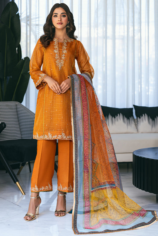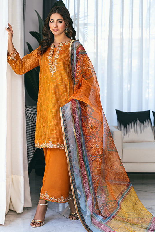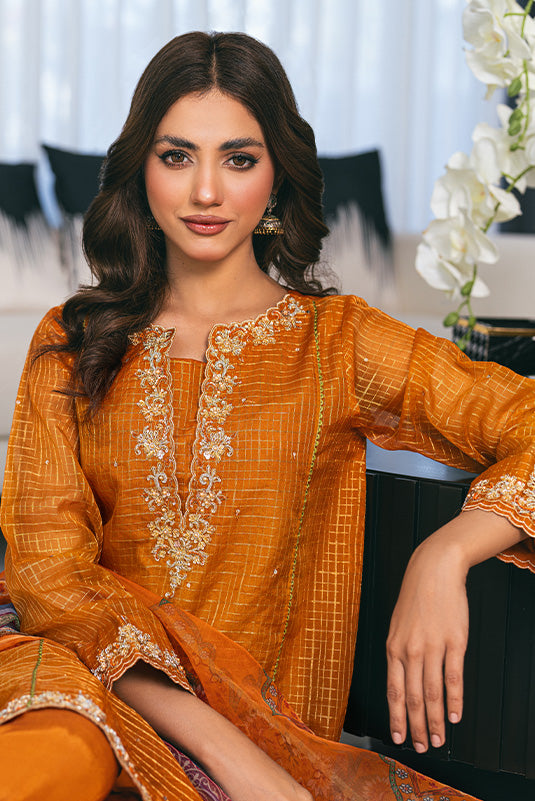 Sarina is a orange paneled shirt made in zari organza. It has intricate handwork done on the neckline ,sleeves and hemline with dabka, kora, sequins.It is paired with hand embellished culotte pants with printed duptta with lace finishing. This look with its vibrant blooming hues is the most eye-catching ensemble of the season.