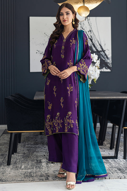 "Shanara", this purple raw silk strainght shirt has screen print highlighted with hand work of kora, dabka,sequins, resham and zardozi work. Neckline adorned with hand crafeted buttons. It is paired with matching pants and tissue silk contrasting duptta with lace trimmings