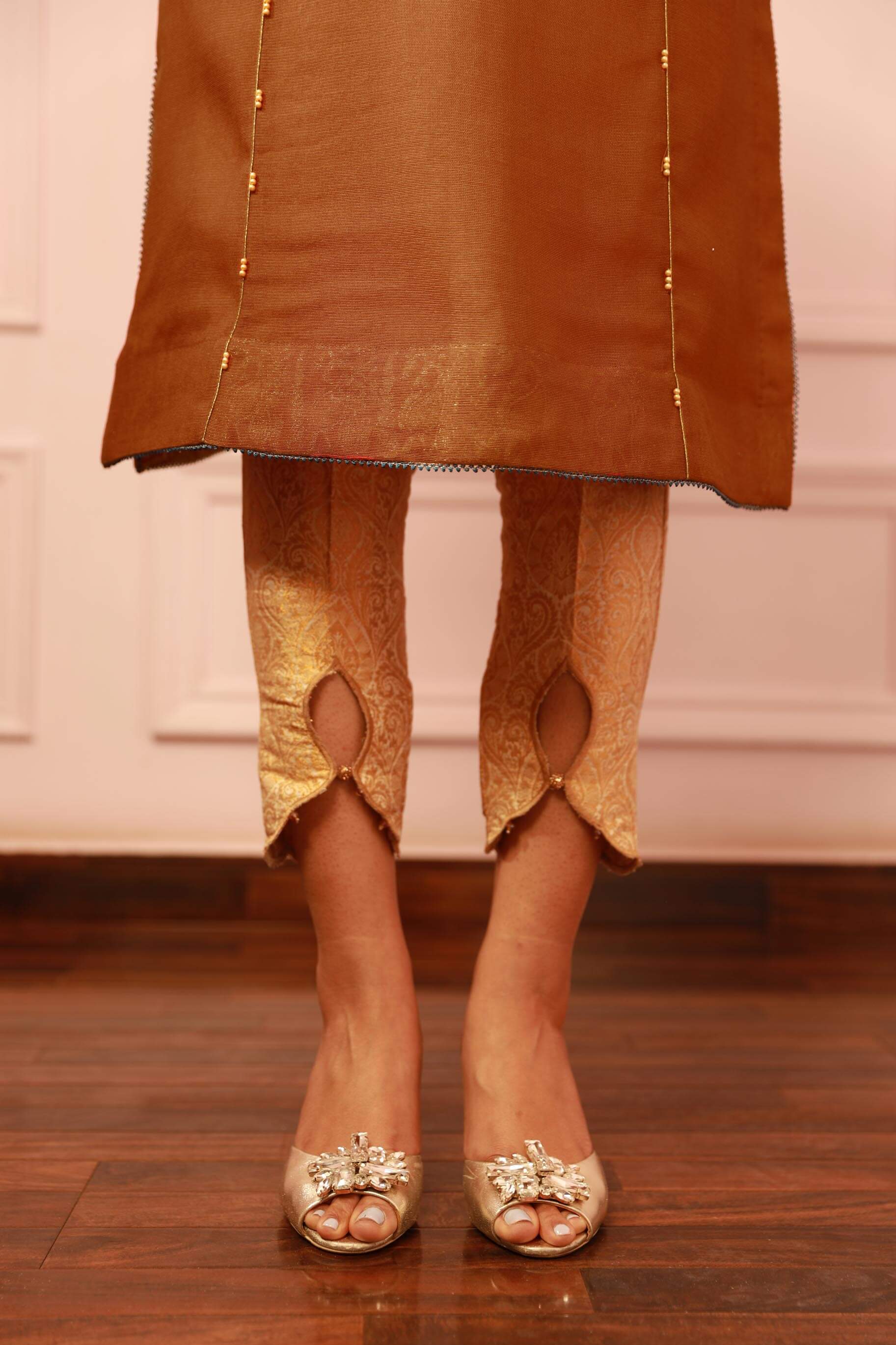Zafran is a tangerine cotton net shirt embellished with intricate mirror and gota detailing on sleeves. The beautiful neckline adorned with buttons and gota flowers. It is paired with gold straights pants.