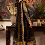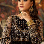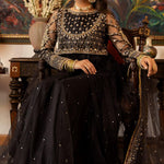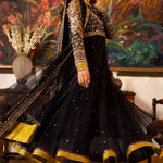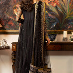 'Kala Sha Kala' is a Luxury Formal Women Three Piece Dress in Black net adorned with hand Embellishments, beautifully encrusted with silver and gold Kora Dabka. It is paired with a heavy dupatta with embroidered borders and scattered sequins finished with purple and green banarsi with black raw silk straight pants.