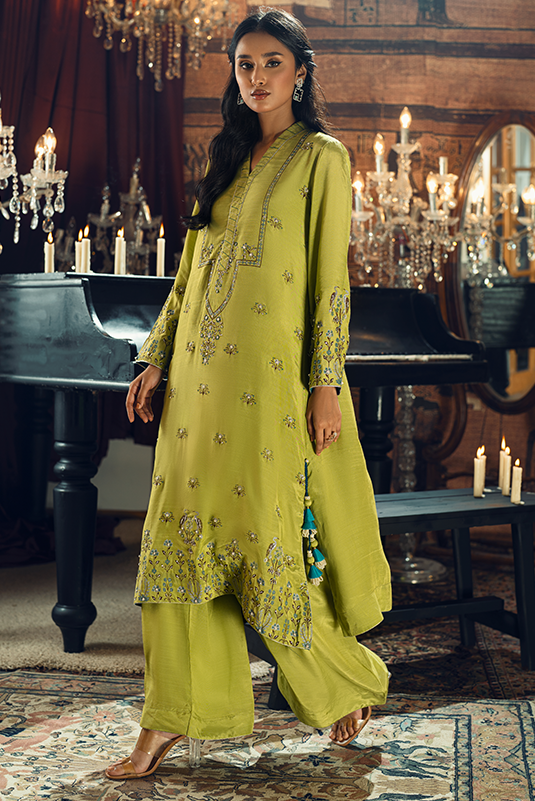 "Aaru" is an Apple green beautiful silk kaftan adorned with alluring screen print on front and sleeves. It is embellished with sequins , pearl,beads and kora work. It is paired with a matching flared pants which is perfect to flaunt in any occasion.