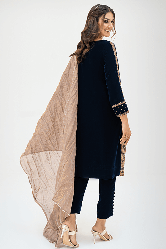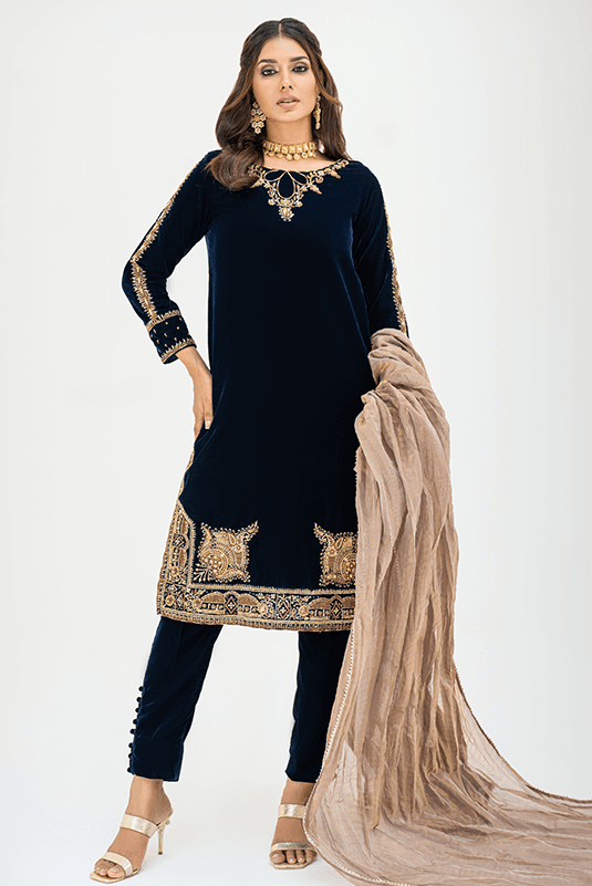 "Abeeha" is a navy blue shirt with detailed hand embellishments. The neckline, sleeves and hemline is finished with heavy embellishment intricately adorned with kora, dabka, sequins. This alluring outfit is paired with velvet matching pants and crush copper maysuri dupatta.