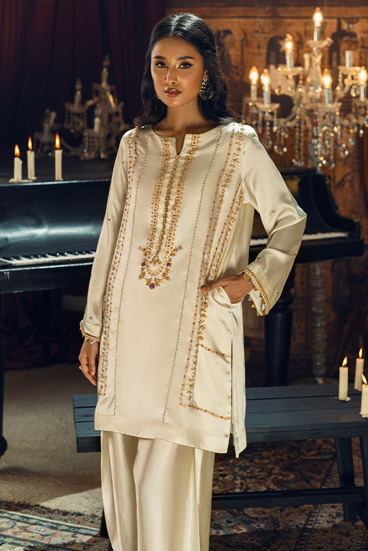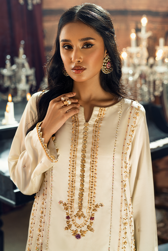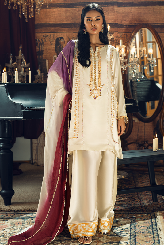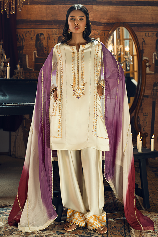 "Akhet" is an exquisite gold screen printed ivory satin silk kurta with hand embroidered embellishment to bring out its festive look. It is paired with shalwar screen printed on the hemline, finished with lace trimmings and 3 tone contrasting color tissue silk dupatta adorned with lace trimmings.
