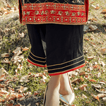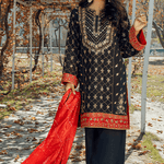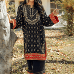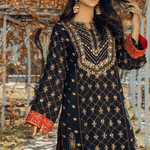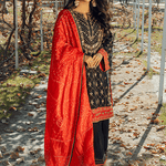 “Alara” is a classic straight kurta heavily embellished with gota, kora and dabka. The embroidery is done on black pk raw silk with applique of red and pink. The look is completed with matching culottes with red and gold finishing, it comes with a contrasting red chunri dupatta with black and gold finishing.