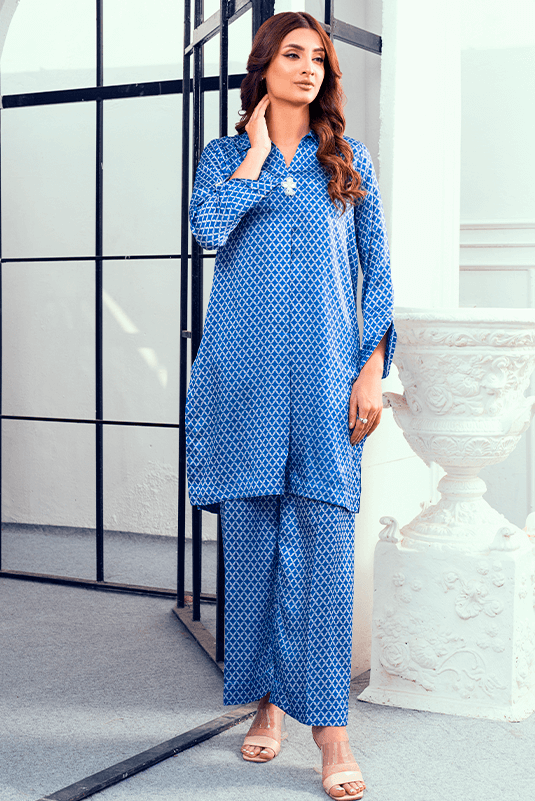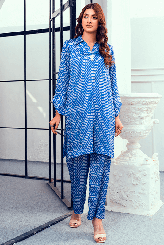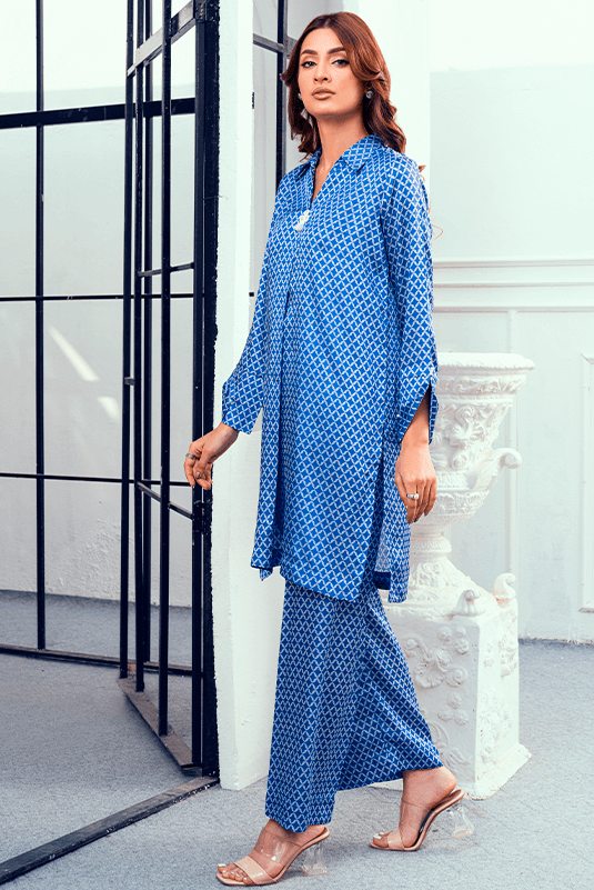 Aster is a geometric printed shirt with box pleat detailing on the front. The neckline and sleeves enchanced with 3D mirror buttons. It is paired with matching culottes.