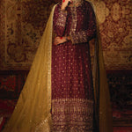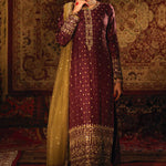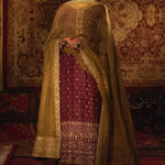 'Azal' has a straight long silhouette in plum, giving it a regal and timeless appeal. The Mughal inspired mehraab motif on daman and dupatta are enhanced by fine hand craftsmanship of aari, kora, dabka and mirror work. The understated charm of the garment is enriched by elaborate olive green net dupatta with embroidered borders and overall chan and booti. It is paired with a plum pure banarsi silk churidaar pajama, completing the look with same banarsi finishing on dupatta and shirt. A customized pouch can be made on order to complete the look.