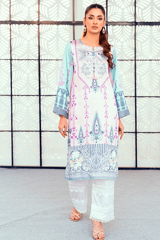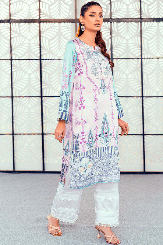 "Azalea" is a lilac color straight silhouette. The neckline features trendy buttons at front. The neckline enhanced with pearls detailing on the hem.
