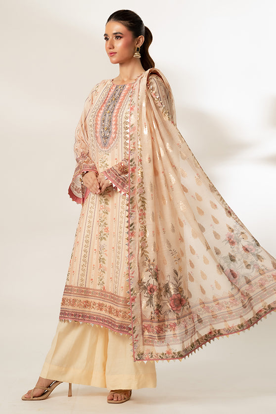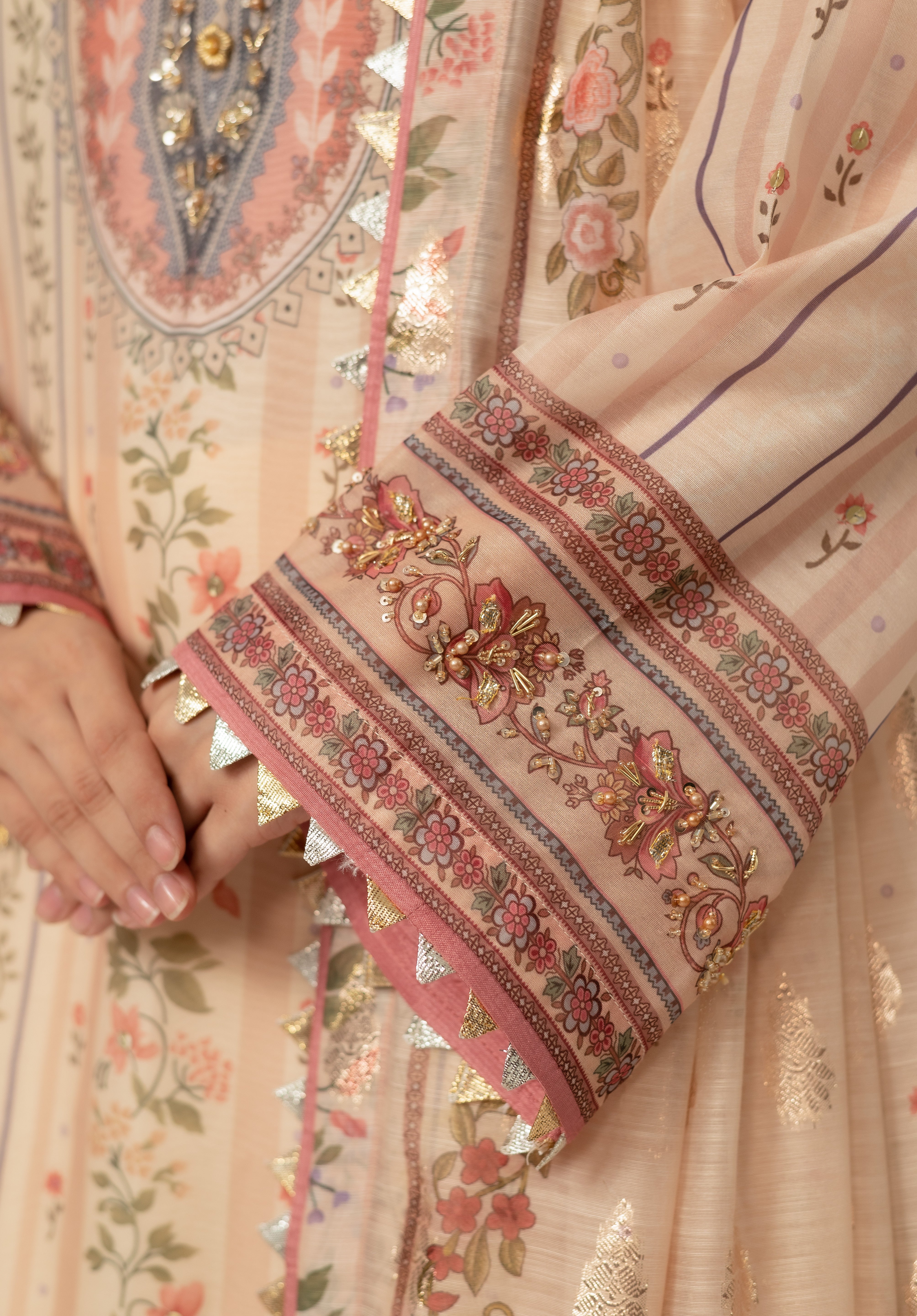 Elegance redefined! This beige digital print dress features delicate floral and intricate patterns in soft pastel shades, giving it a refined look. The hand-touch effect adds a textured and artistic touch, and the dress is beautifully adorned with hand-touching kora, dabka, and gota work. Perfect for festive or casual wear.